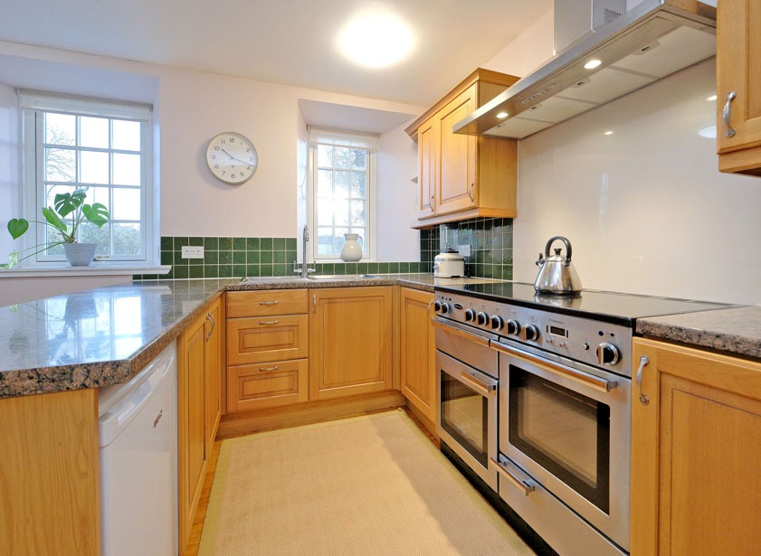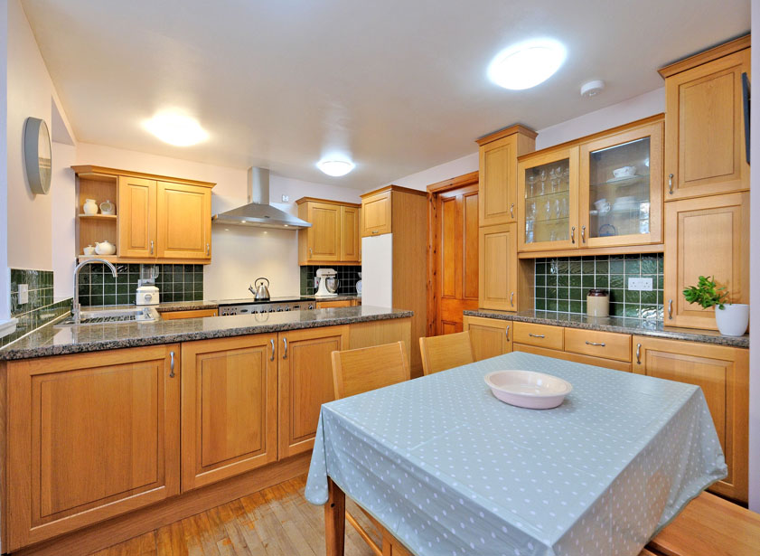 Returning to the entrance hallway, a door allows entry to the dining kitchen which is sufficiently proportioned to allow for the placement of a table and chairs. Fitted with a range of wooden base and wall units, a central island incorporates storage and provides an excellent work surface. The electric five induction ring Range Master cooking range with double oven and plate warming drawer with extractor fan above is to remain, along with the free-standing fridge in the kitchen.