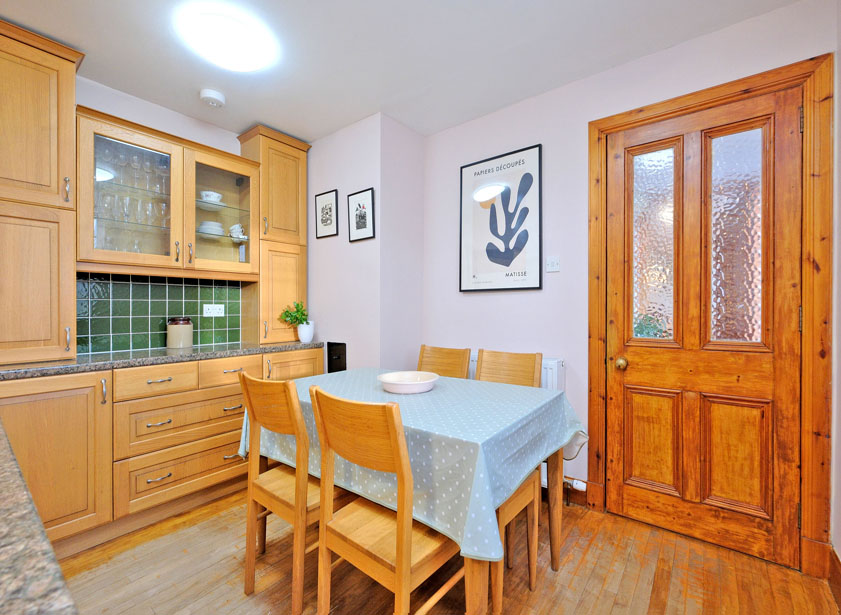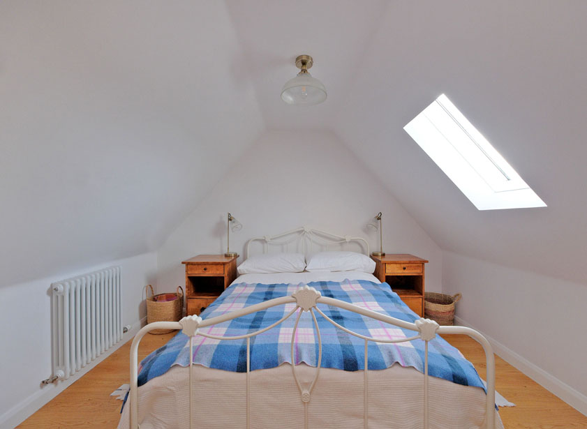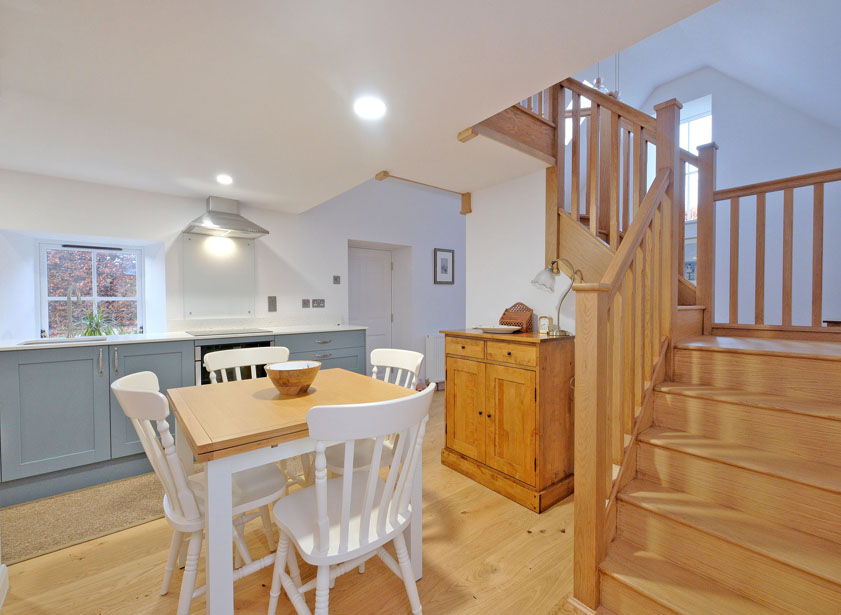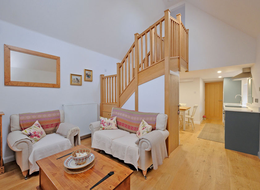 Beyond the dining kitchen is the living area. Central to the living space is a wooden staircase which leads to the double bedroom. There is a fitted cupboard below the staircase.