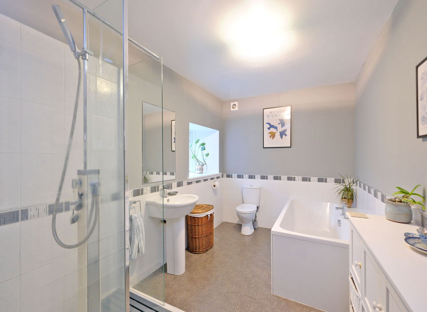 The modern, four-piece bathroom suite comprises a bath, large shower cubicle, wash hand basin and WC. The bathroom benefits from a heated towel radiator, a window and an extractor fan.