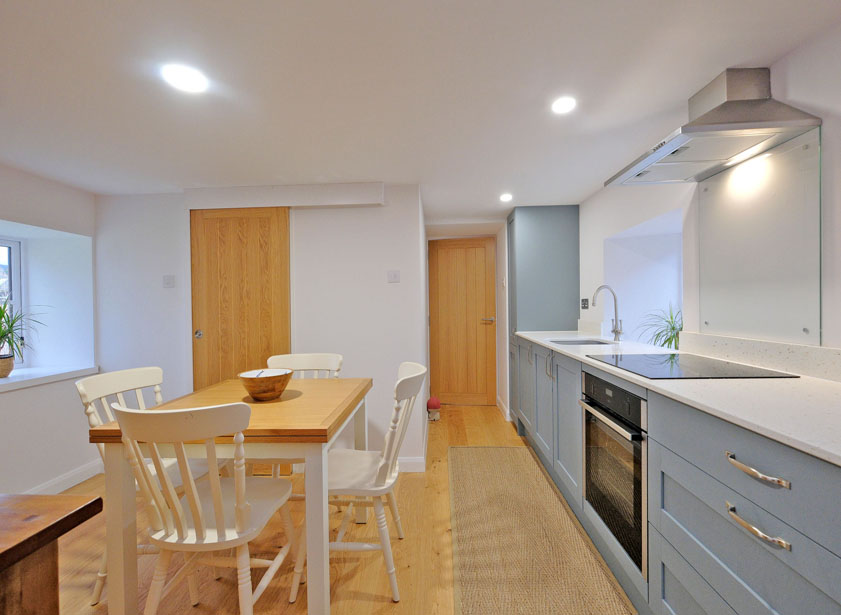 The annex kitchen is fitted with a range of grey matte base and wall units incorporating a sink, electric induction hob with electric oven below and extractor fan above, there is space for a table and chairs and a sliding door allows access to a compact three-piece shower room featuring fitted storage, a heated towel radiator and an extractor fan.
