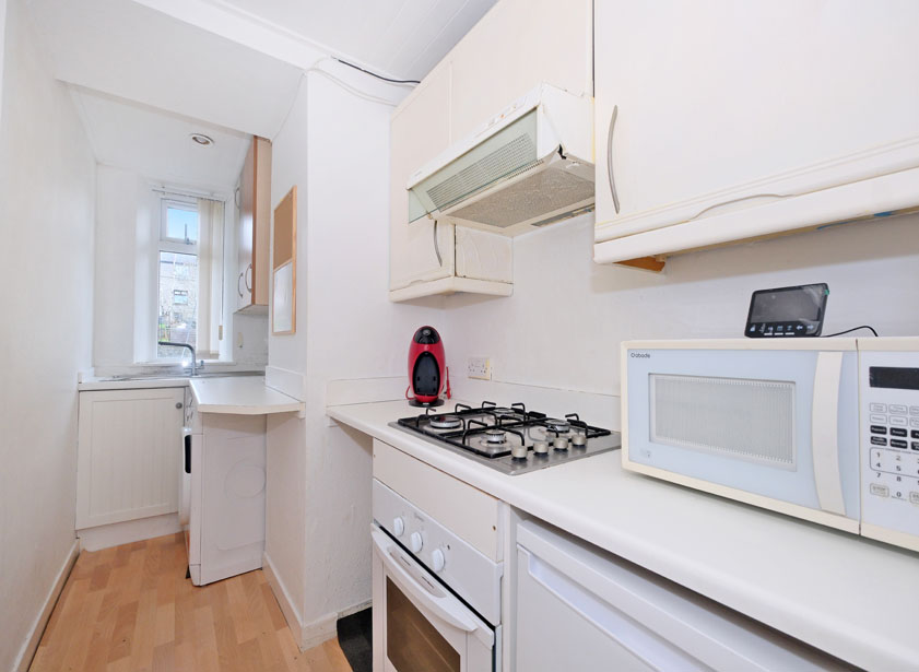 A bright galley kitchen nis fitted with a range of wall and base units incorporating roll front work surface, stainless steel sink with mixer tap and drainer. Integrated 4 ring gas hob with extractor hood and oven/grill will be included in the sale along with free standing washing machine and fridge. Window overlooks the rear of the property.
