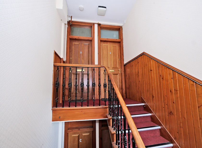 Steps with wrought iron handrail leads to the tenement entrance. Hardwood door provides access to the communal hall and stairwell. Windows on mid landings allow natural light into the area. Access to the fully enclosed communal rear garden.
