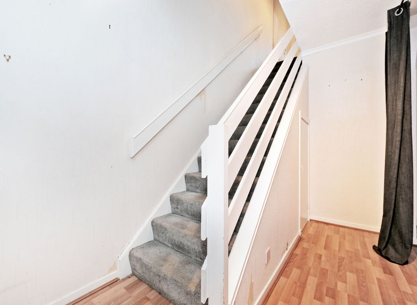 On semi open plan with the lounge/ dining area, the hallway features a deep under stair cupboard and a further cupboard housing the electricity consumer unit and meter.