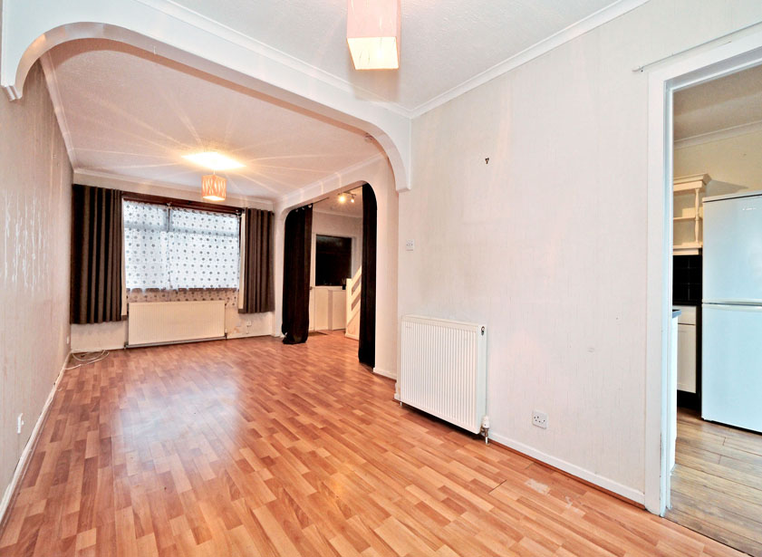 A well-proportioned lounge/ dining area boasts picture windows to both front and rear of the property. Ample space for a range of furnishings including a dining table and chairs.