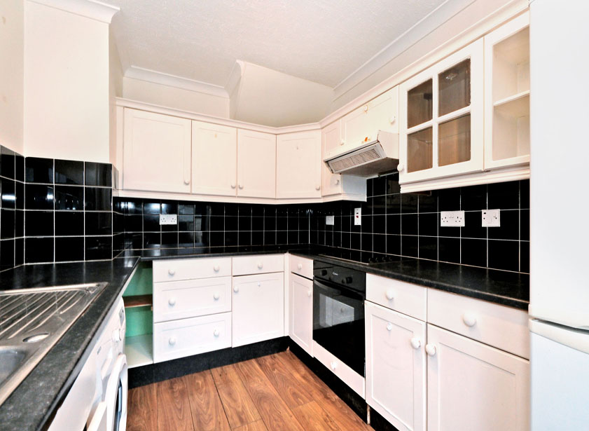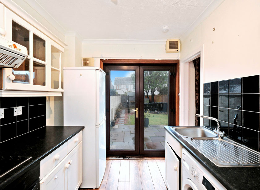 Accessed via the dining area, a galley style kitchen is fitted with a range of wall and base units incorporating roll front work surface and extensive splashback tiling. Stainless steel sink with mixer tap and drainer. Integrated hob with extractor canopy, oven/grill to remain along with the free standing washing machine and fridge/ freezer. Double French doors to the rear garden.