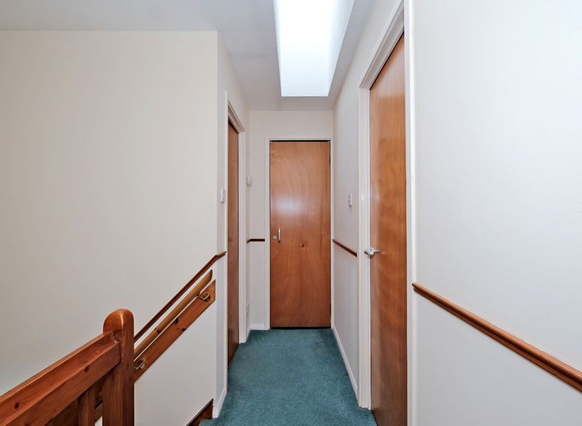 Ascending the carpeted staircase there is the mezzanine landing which overlooks the side of the property. The first floor landing receives good natural light from a skylight, while a large airing cupboard houses the central heating boiler and wooden shelving.