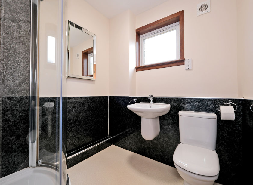 Completing the living accommodation is the spacious shower room which is aqua paneled around the suite. A curved corner shower enclosure houses a mains shower appliance, while there is also a white wash hand basin and WC. Further features include a decorative mirror and chrome towel rail.