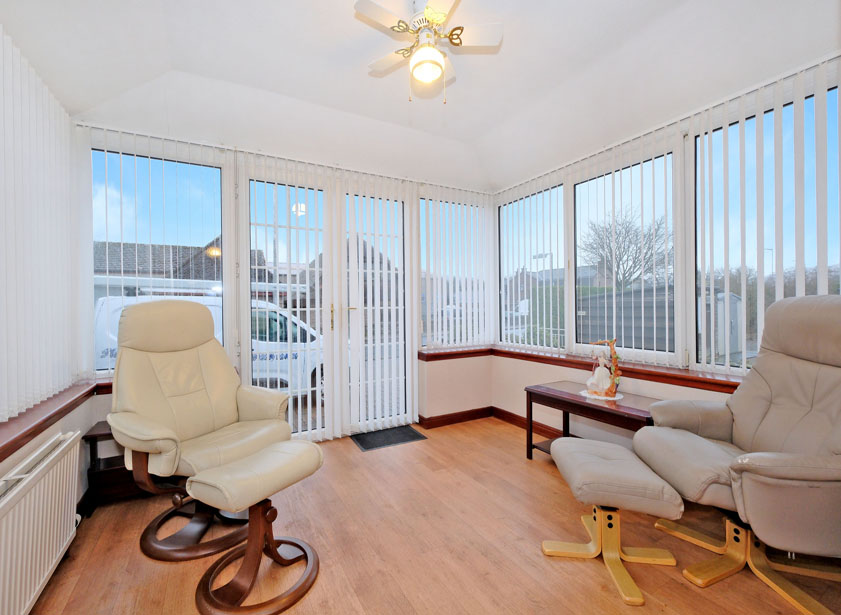 The lounge is a bright and inviting room which is semi open plan with a triple aspect sunroom. The lounge features a gas fire set on a stone hearth with a stone surround and wooden mantel piece. The lounge and sunroom are linked by a rectangular opening. The sunroom has windows to the east, south and west, with a door in the southerly end providing access to the front of the property.