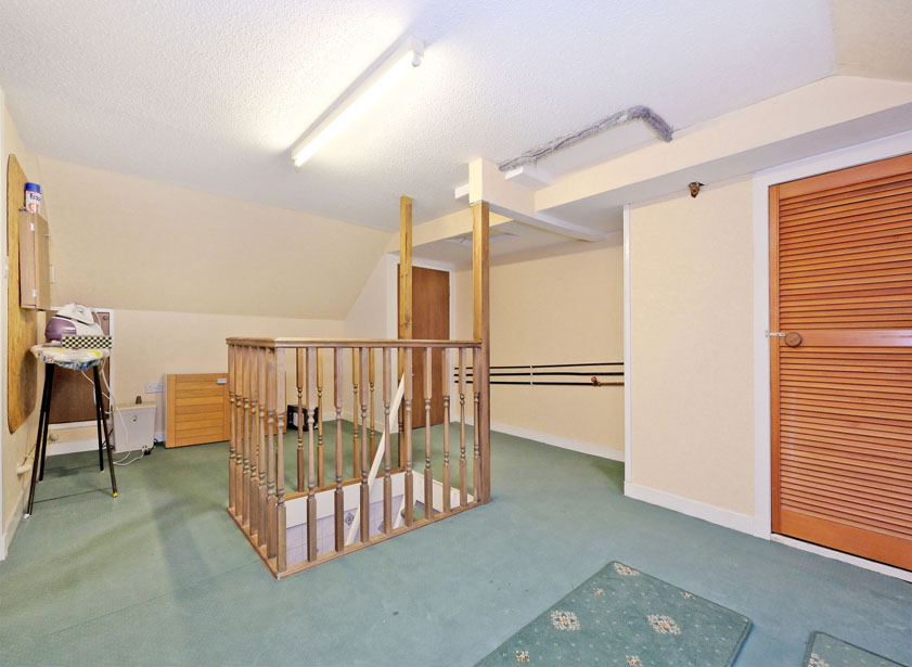 Enter the property at the side via the partially glazed main door into a vestibule with hatch to the sub floor. The vestibule gives access to the main hallway, which, in turn leads to the lounge, dining kitchen, two bedrooms and family bathroom. Concealed behind a door in the hallway is a fixed ladder with banister which allows access to the attic rooms.