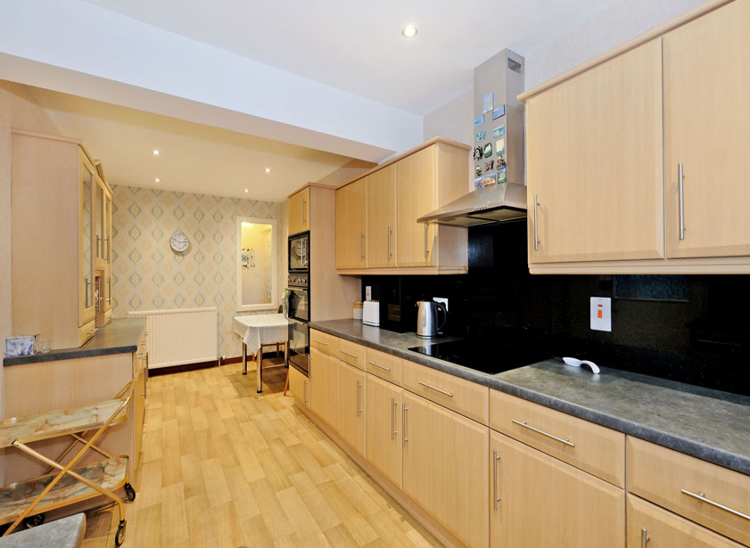 The dining kitchen is to the rear of Clochnaben. With ample space for the placement of a table and chairs. The kitchen is fitted with a range of light wood effect base and wall units with contrasting dark grey slate effect worksurfaces and complementing splashback. Integrated appliances comprise of Bosch electric induction hob with extractor fan above, electric Smeg eye level grill and oven with Kenwood microwave above, fridge and Bosch dishwasher. There is space for a washing machine. A door from the kitchen leads to a paved patio which is ideally positioned for al-fresco dining.