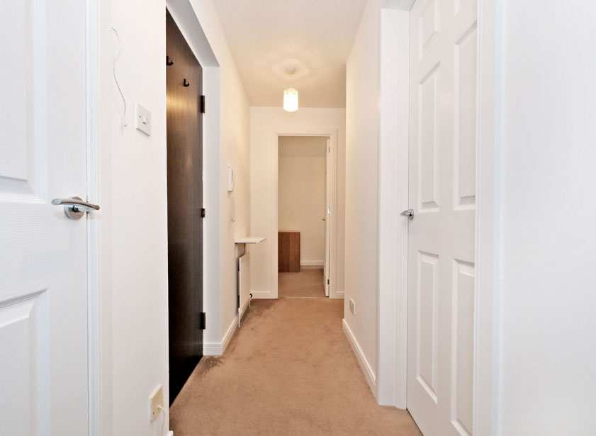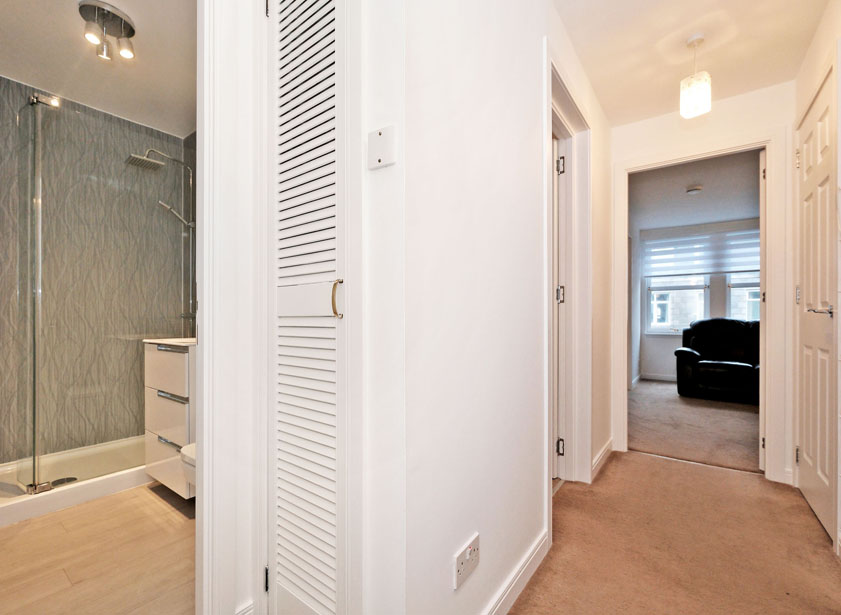 A hardwood entrance door leads into the welcoming reception hall. Fully carpeted and of neutral decoration, the security entry handset is located within the hall. A deep fitted cupboard houses a range of shelving and electrical apparatus, while a further cupboard with white painted louvre style door is also ideal for storing larger household items if required.