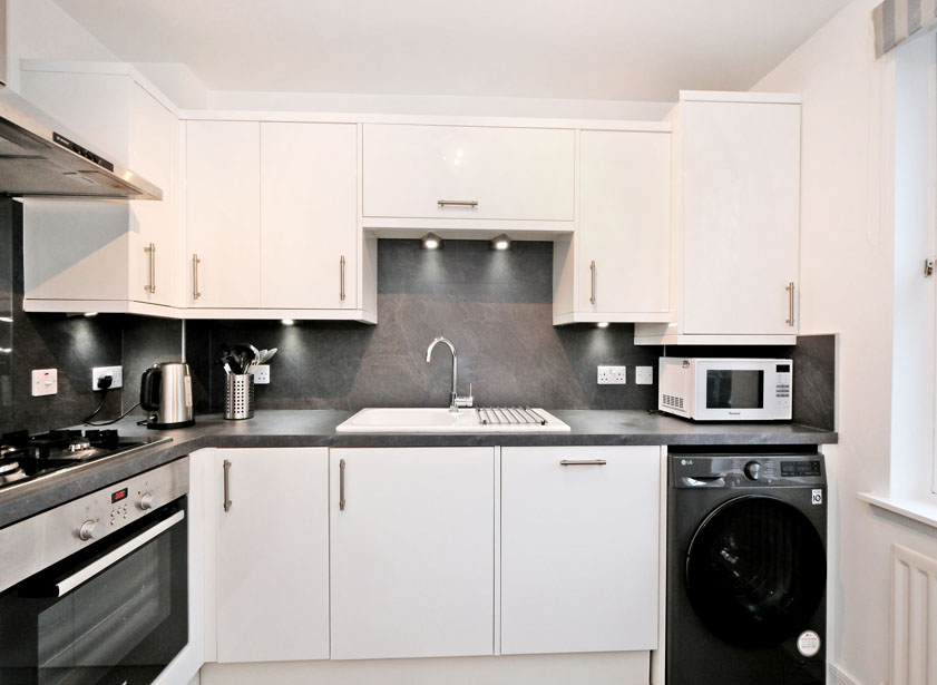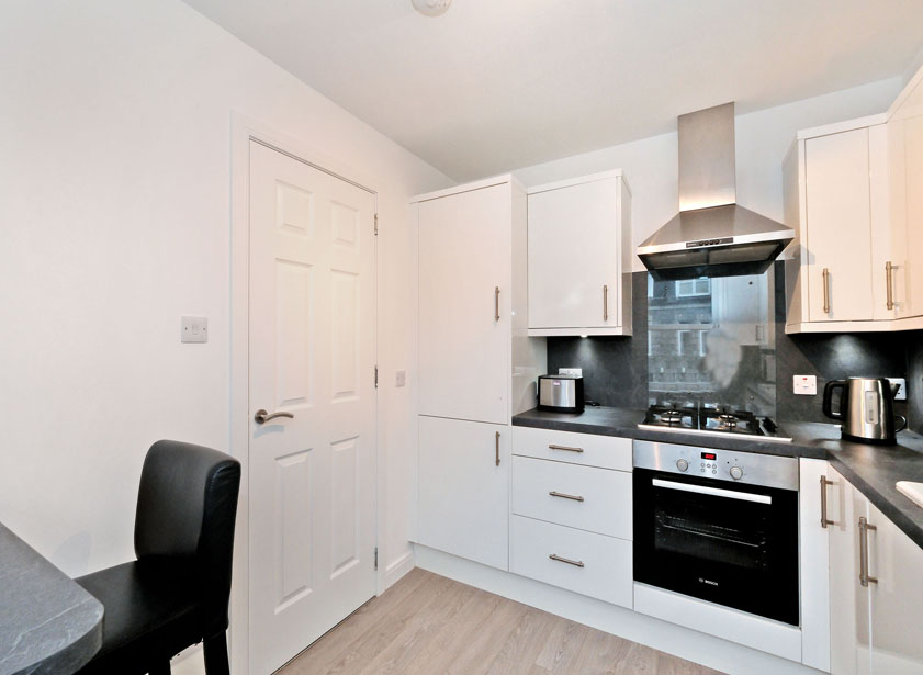 The lounge/dining room provides ease of access to the contemporary dining kitchen. Featuring a good range of white gloss base and wall units with under unit lighting, a contrasting L-shaped work surface with splashback incorporates a ceramic sink with drainer and a four ring gas hob with stainless steel extractor canopy above. Within the kitchen, there are a range of appliances, including an integrated fridge/freezer, oven, dishwasher and an under counter washing machine/tumble dryer. A window allows for bright views over Union Grove, while an elevated breakfast bar with stools provides space for informal dining. The central heating boiler is concealed within one of the wall units.