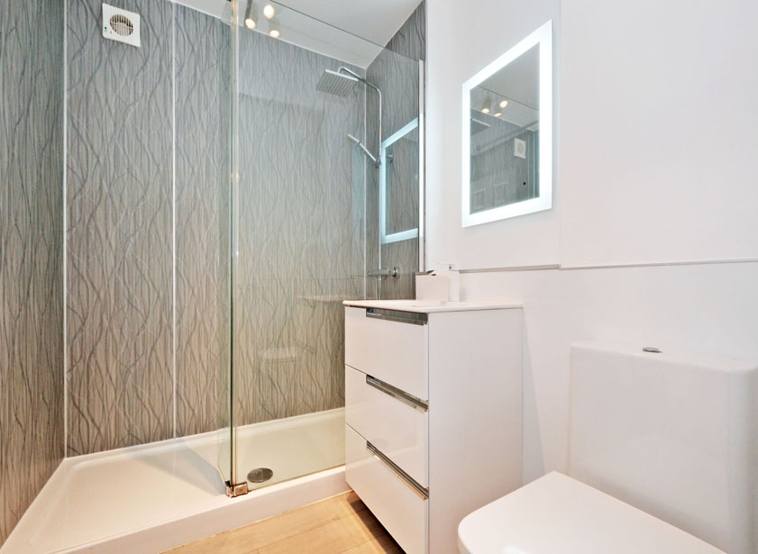 The modern shower room is inclusive of a white two piece suite with walk in shower enclosure housing a mains shower appliance with rain effect shower head and wand. Aqua panelled around the suite, the wash hand basin sits atop a white gloss vanity unit with drawer storage, whilst there is a de-mist panel mirror above. Further features include a three point halogen downlighter, chrome towel rail and laminate wood effect flooring.