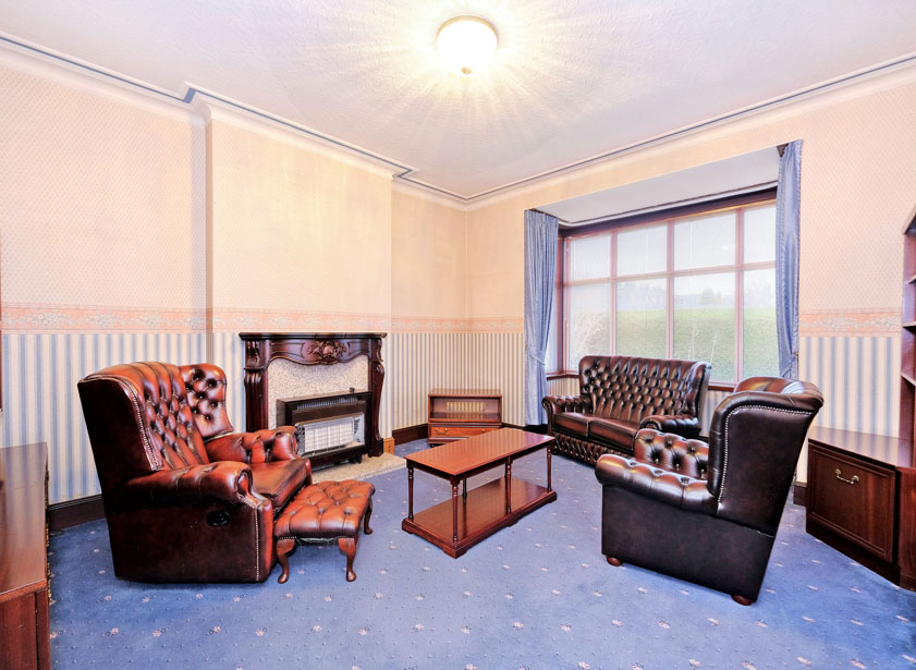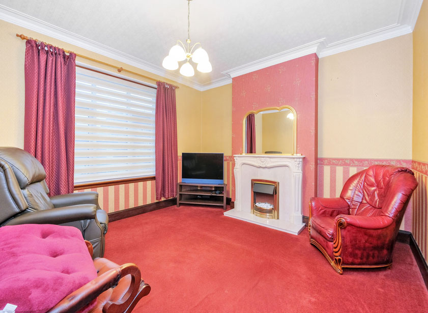 Situated to the rear of the property, a spacious sitting room/ dining room with picture window enjoys views over the well maintained rear garden. An attractive wooden fire surround with marble hearth houses an electric inset fire. Moulded coving.