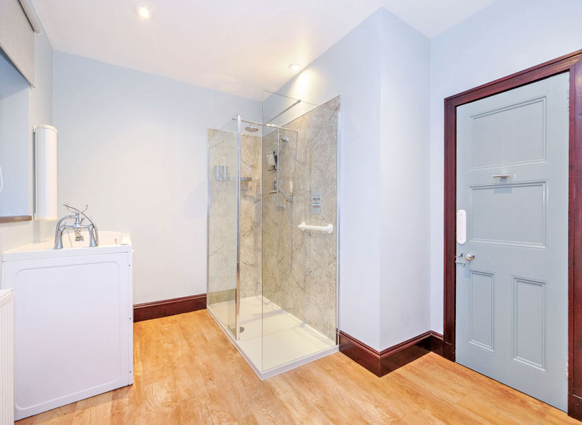 A well-appointed family bathroom completes the ground floor accommodation. Fitted with a modern white suite comprising w/c, vanity unit housing the wash hand basin. Luxury mini walk -in easy access deep soak bath, with Jacuzzi and shower attachment. Separate fully aqua lined walk-in, double shower enclosure housing a rainfall and further shower attachment. Heated towel rail. Twin opaque windows to the rear.