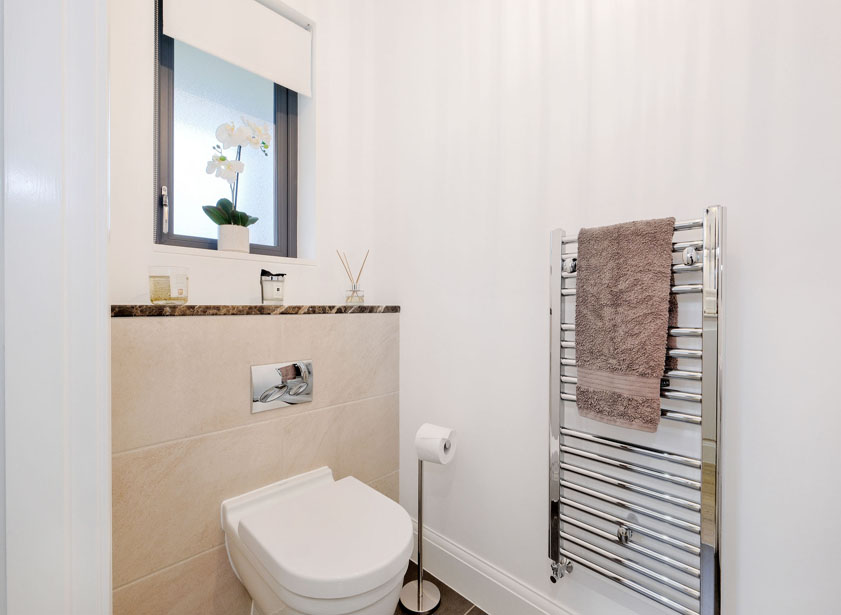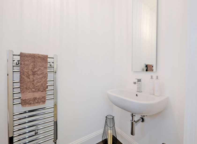 A good sized cloakroom fitted with a white suite comprising suspended wash hand basin and w/c with concealed cistern. Opaque window to the front. Heated towel rail, ceramic tiled floor.