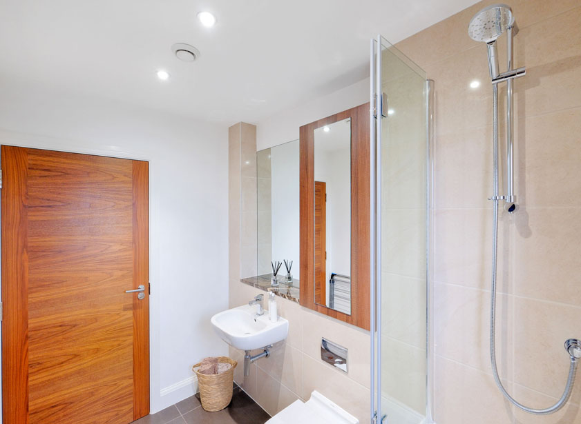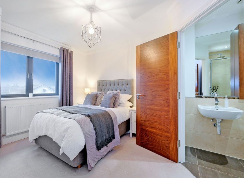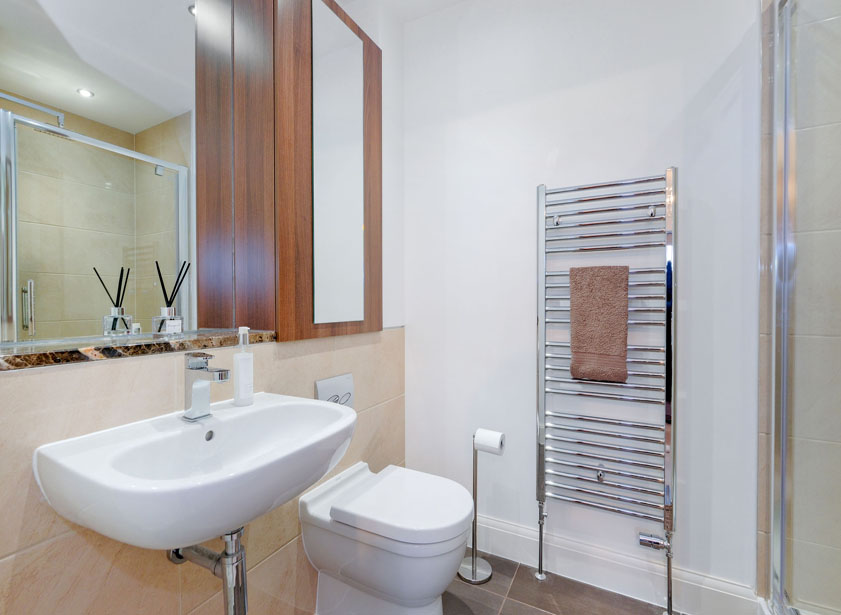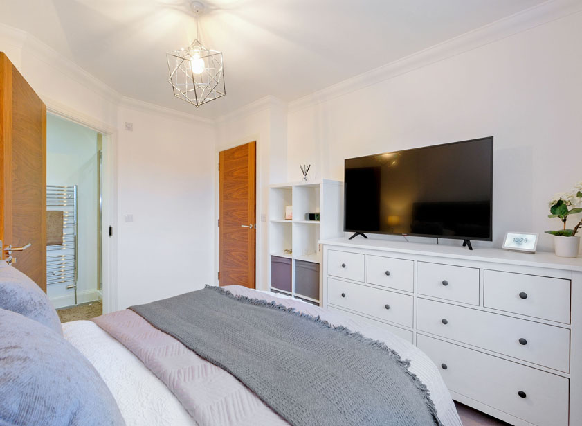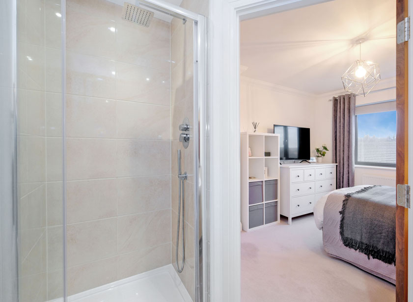 The centrally set ensuite is fitted with a white suite comprising suspended wash hand basin, w/c with concealed cistern, display sill with fitted wall cabinet. Fully tiled shower enclosure housing a rainfall and further shower attachment. Heated towel rail. Ceramic tiled floor.