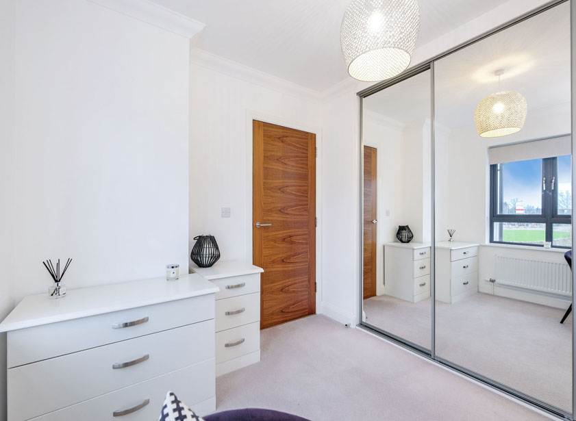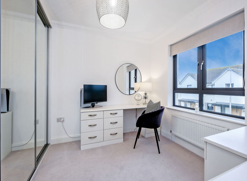 A further bright double bedroom located to the front of the property enjoys an open outlook and is fitted with extensive fitted wardrobes with sliding mirrored doors.