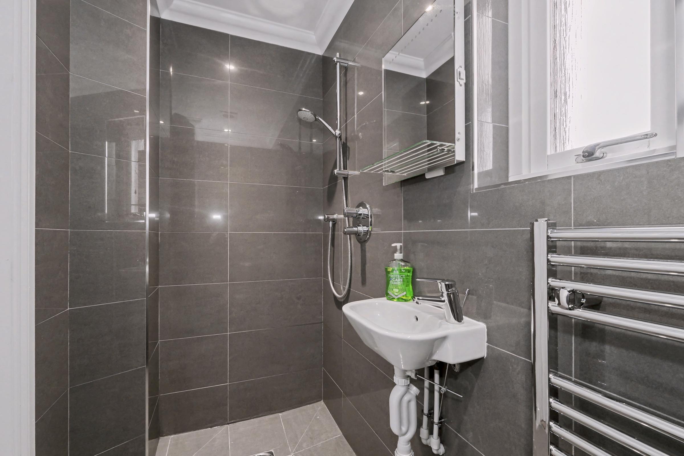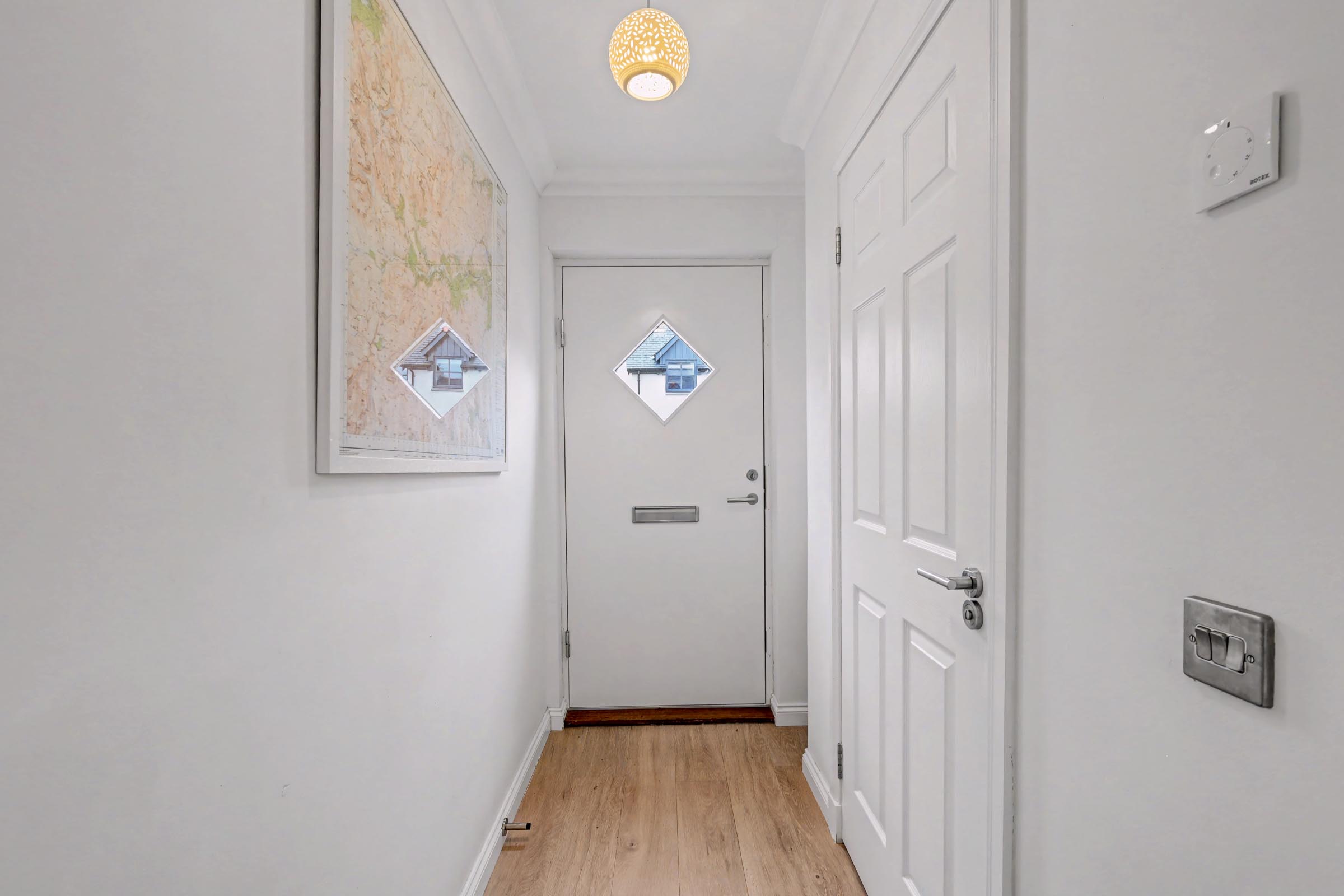 The entrance door with glass panel, gives access to the welcoming vestibule, fitted with attractive wood effect laminate flooring and conveniently houses a sleek walk-in wet room with a three-piece suite, chrome ladder effect towel rail and an opaque side facing window.