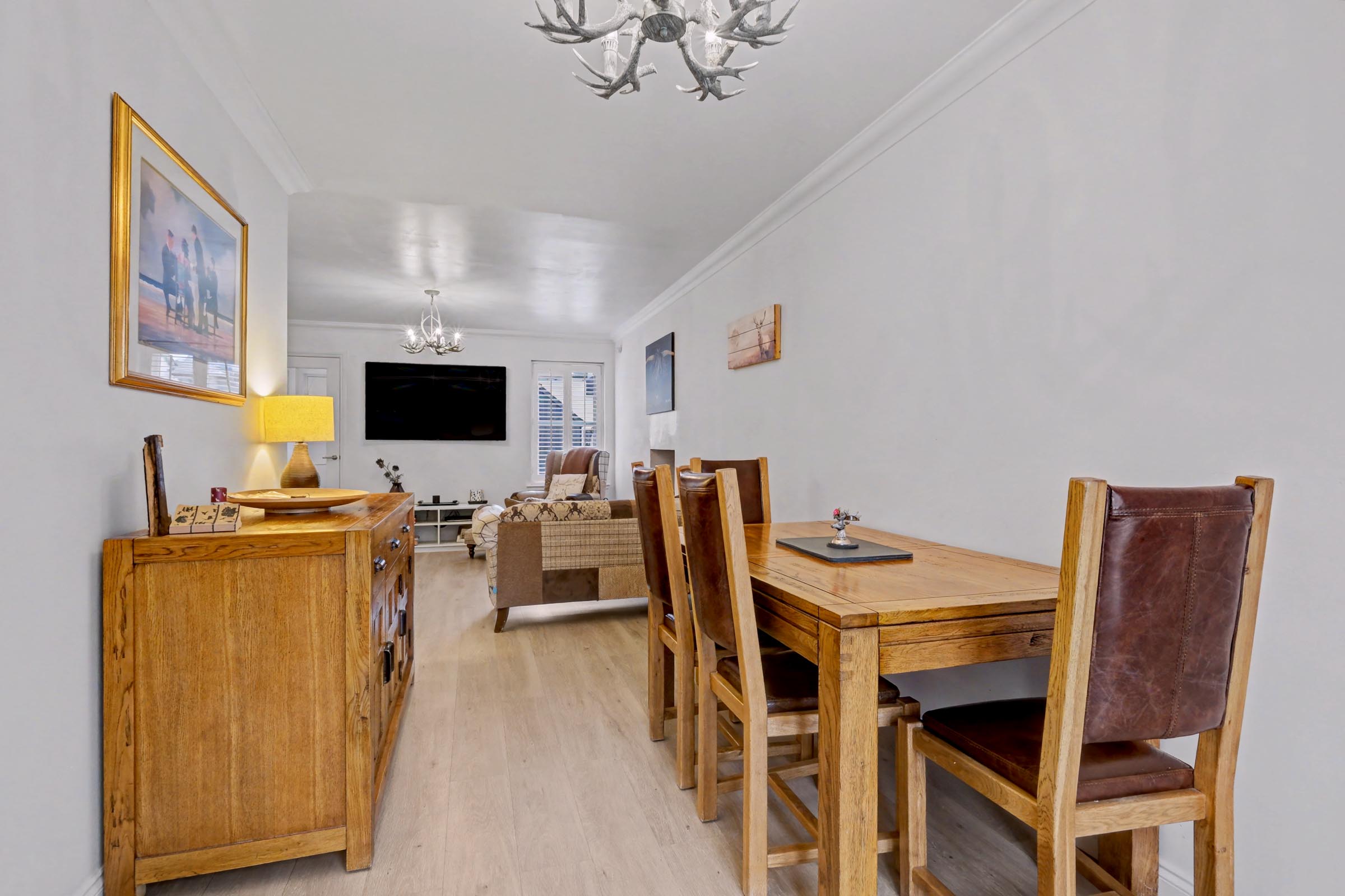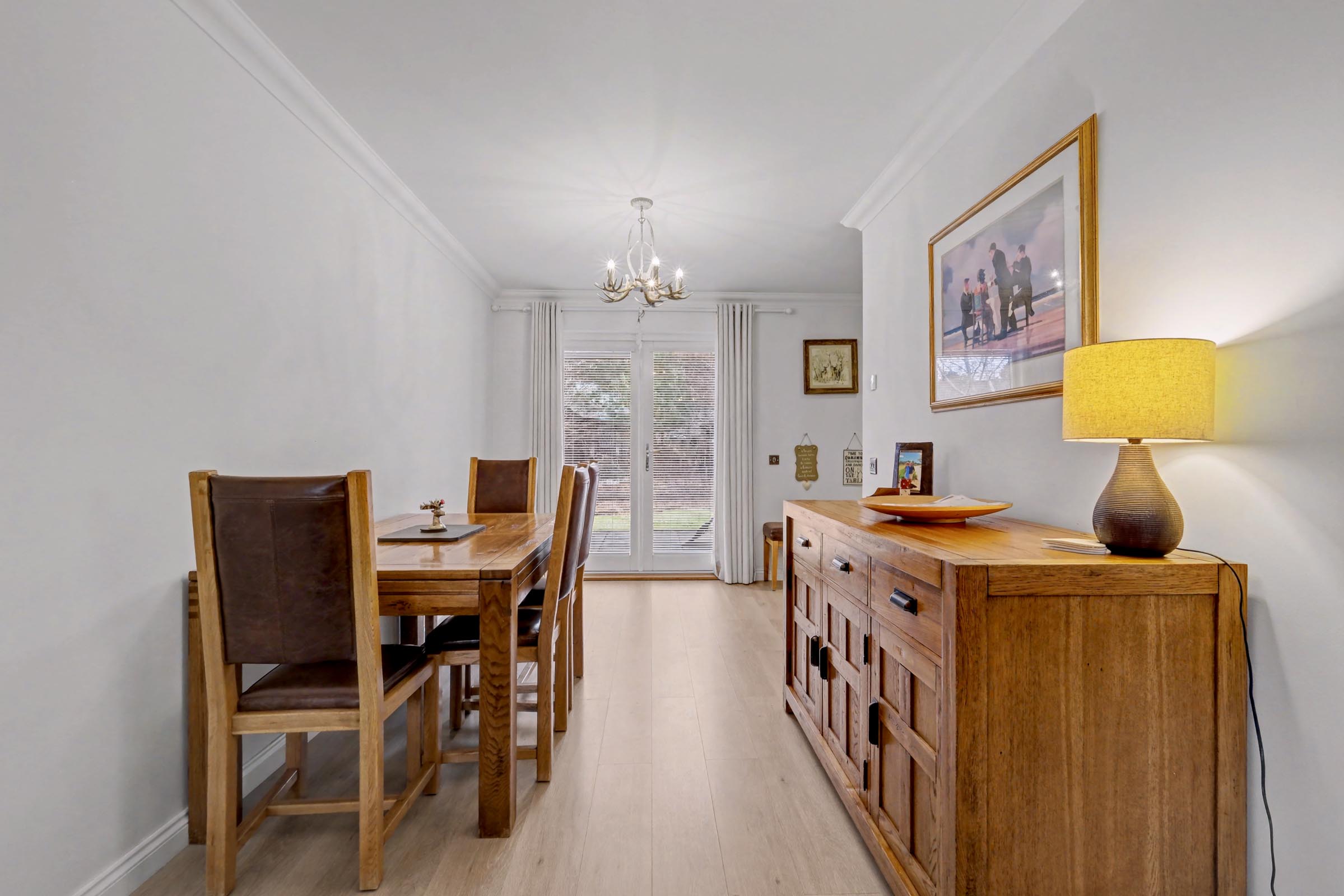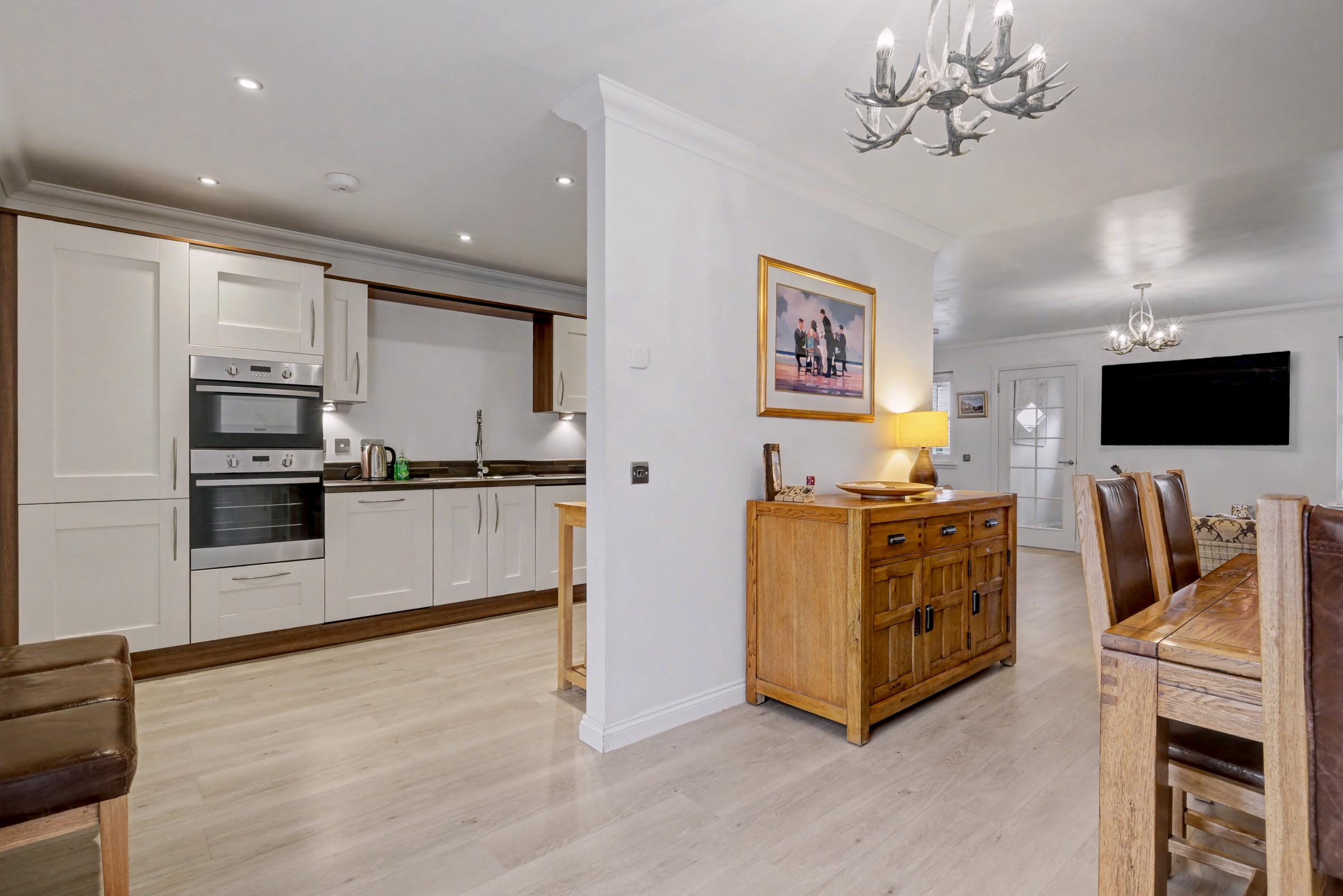 The dining room is a spacious area, with French doors leading out to the rear garden. A partition opening gives access to the well-appointed dining kitchen fitted with ample sleek, neutral wall and base units with contrasting work surface and upstand incorporating a 1 ½ sink and drainer with mixer tap. Integrated appliances include an induction hob with stainless steel extractor hood above, electric double oven for effortless entertaining, washing machine and a dishwasher. Strategically placed downlighters and laminate flooring complete this area.
