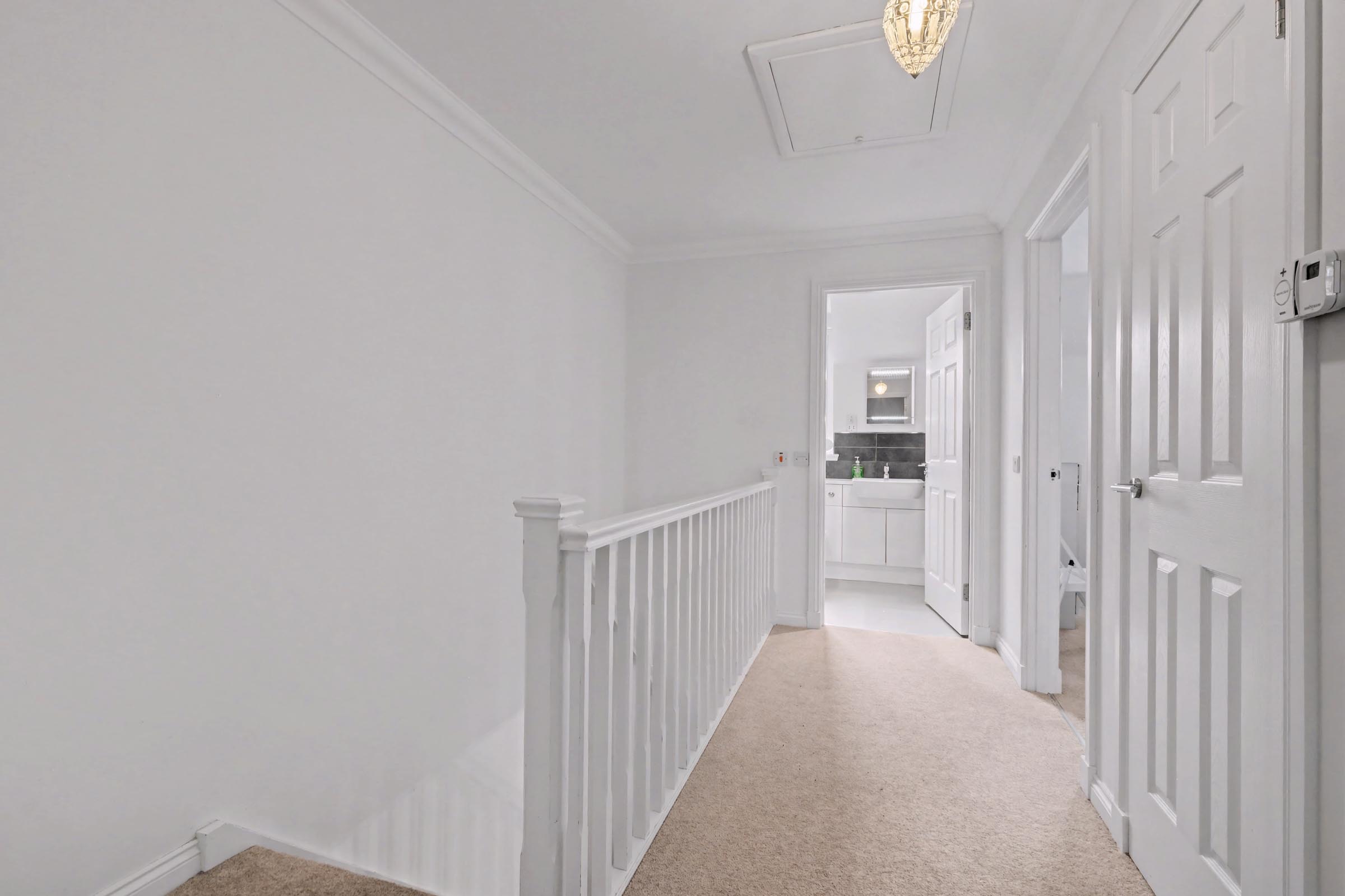 Returning to the lounge, the carpeted staircase, with an under-stair cupboard housing the air source heating pump, rises to the upper landing complete with the attic hatch and a built-in cupboard storing the water tank and shelving providing added storage.