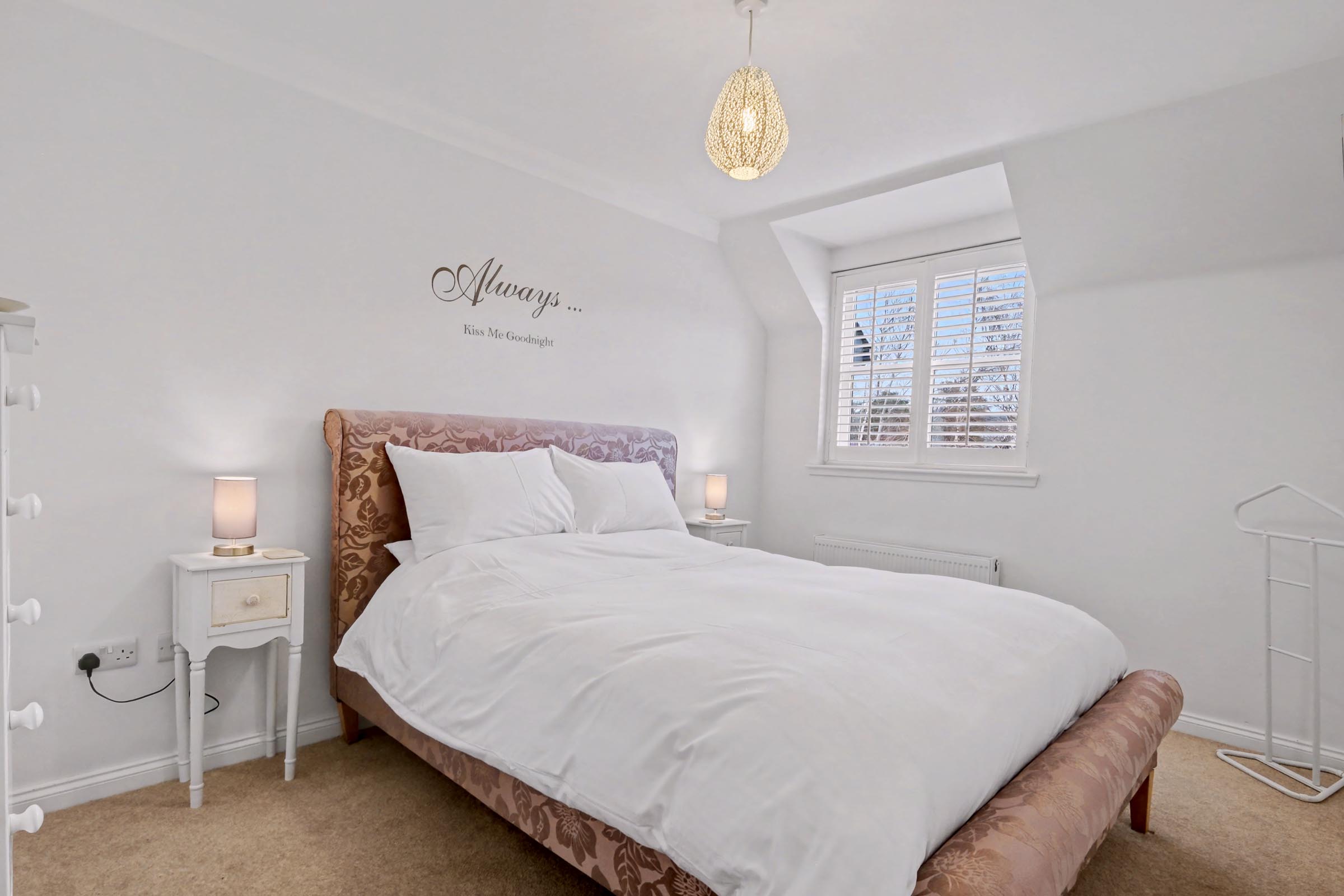 Overlooking the rear boasting a scenic outlook, bedroom two, currently utilised as the principal bedroom, is of generous proportions. Ample space for free-standing furniture and fitted with a neutral carpet and central light fitting.