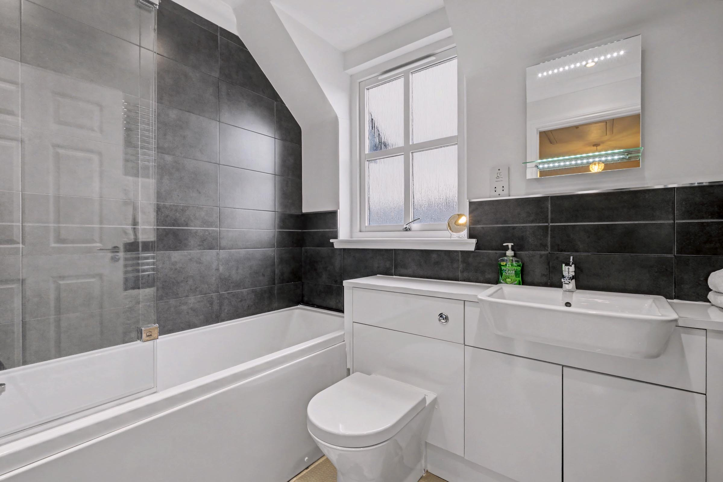 The well-appointed family bathroom with opaque window to the front, is fitted with a modern three-piece white suite comprising a WC, wash hand basin set within a vanity unit offering an abundance of storage, a bath with an overhead shower complete with shower screen and tiled splashback. Ambient recess lighting, vinyl flooring, chrome ladder effect heated towel rail and tiled to dado height.