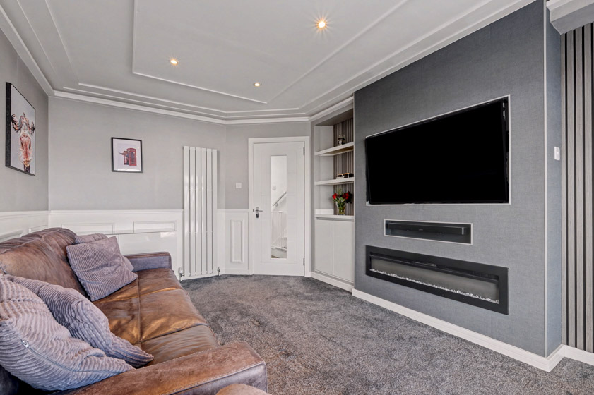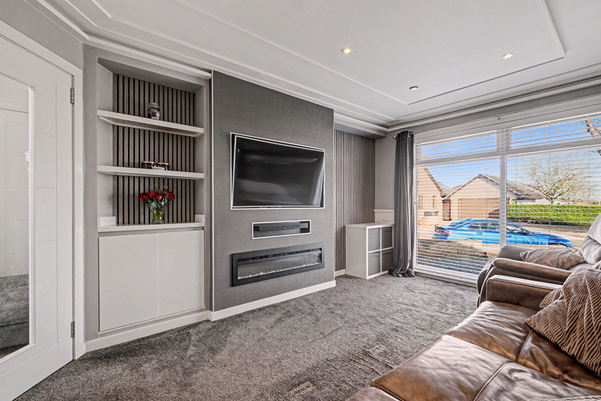 A light and airy lounge with full height picture window overlooks the front of the property. A modern media wall houses a wall mounted TV bracket and space for sound bar, along with an inset electric fire. Ambient ceiling lighting.