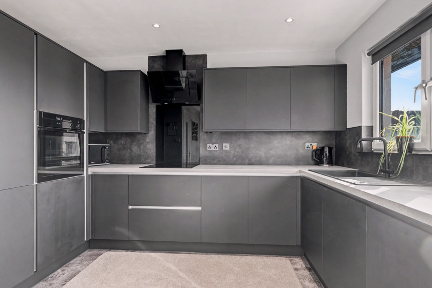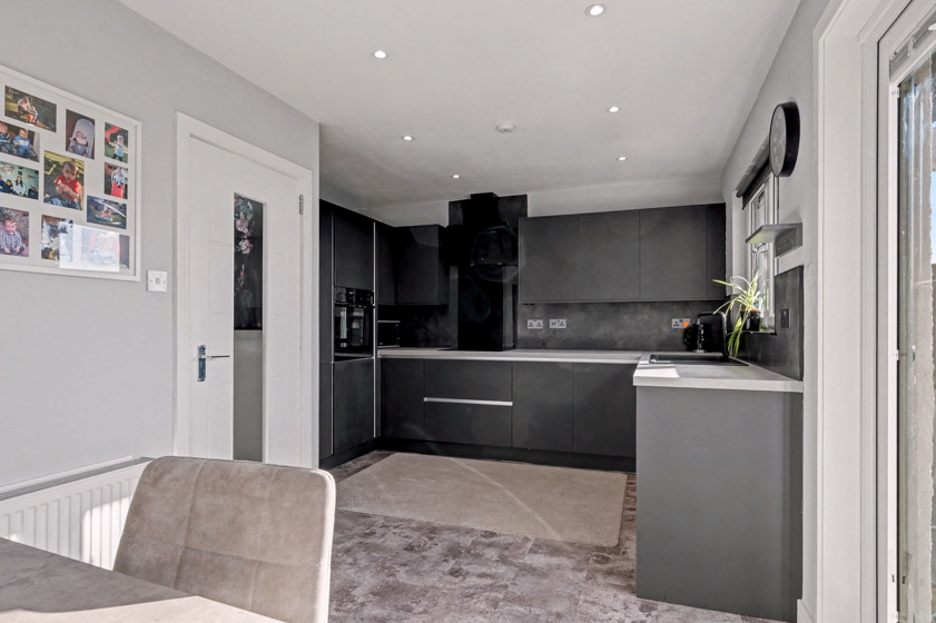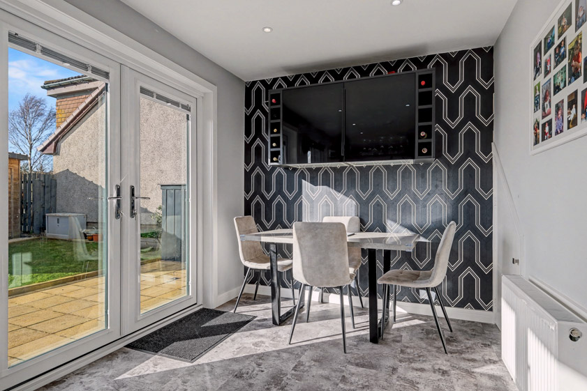 A glazed internal door leads to the well appointed dining kitchen, fitted with a wide range of wall and base units in a contemporary gloss finish. Ample work surface with co-ordinating splash backs incorporating a Franke sink with mixer tap and drainer. Integrated halogen hob with extractor canopy, oven/grill, fridge, freezer and dishwasher to remain. Ample space for a family dining table and chairs Window to the rear and double French doors from the dining area leads to the rear garden.