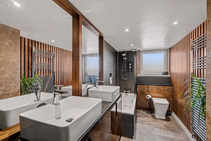 Also forming part of the recent conversion, a beautifully presented family bathroom is fitted with a white suite comprising extensive vanity unit with matching wall cabinets housing twin wash hand basins, w/c with concealed cistern and bath with shower over and glazed screen alongside. Opaque window to the front, heated towel rail, Expelair.