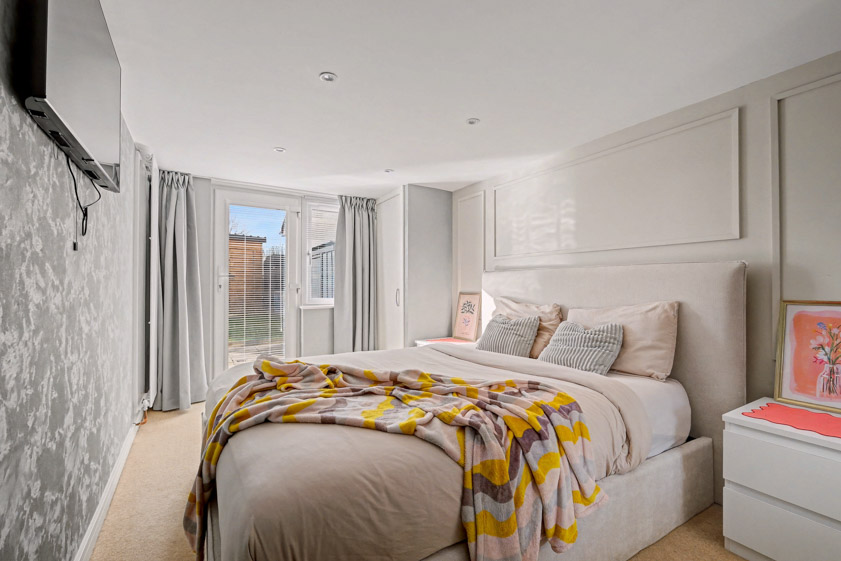 Forming part of the conversion, a generous double bedroom features a glazed UPVC door with window alongside to the rear garden. A double fitted wardrobe with sliding mirrored doors provides ample shelf and hanging space. Wall mounted TV bracket to remain.