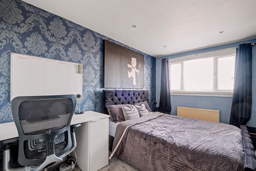 A spacious double bedroom with dormer window overlooking the front of the property offers ample space for free standing furniture. Wall mounted TV bracket to remain.