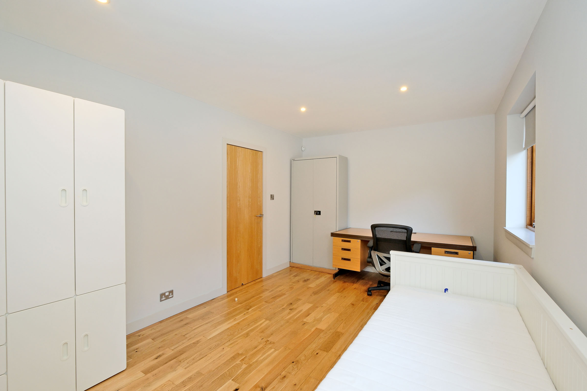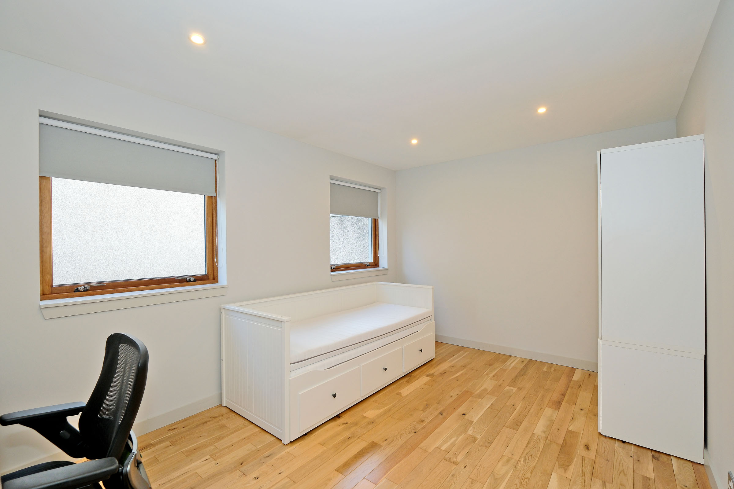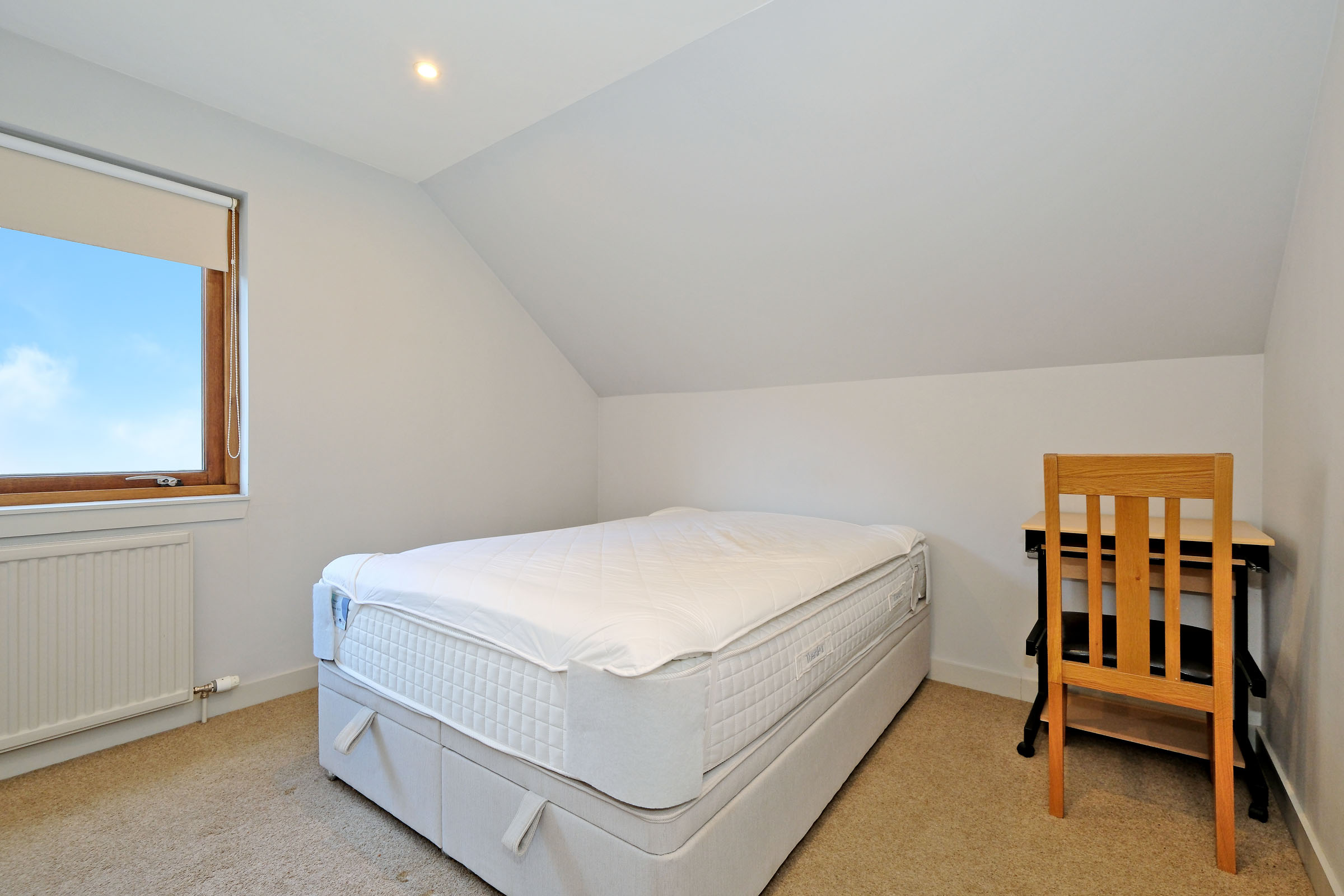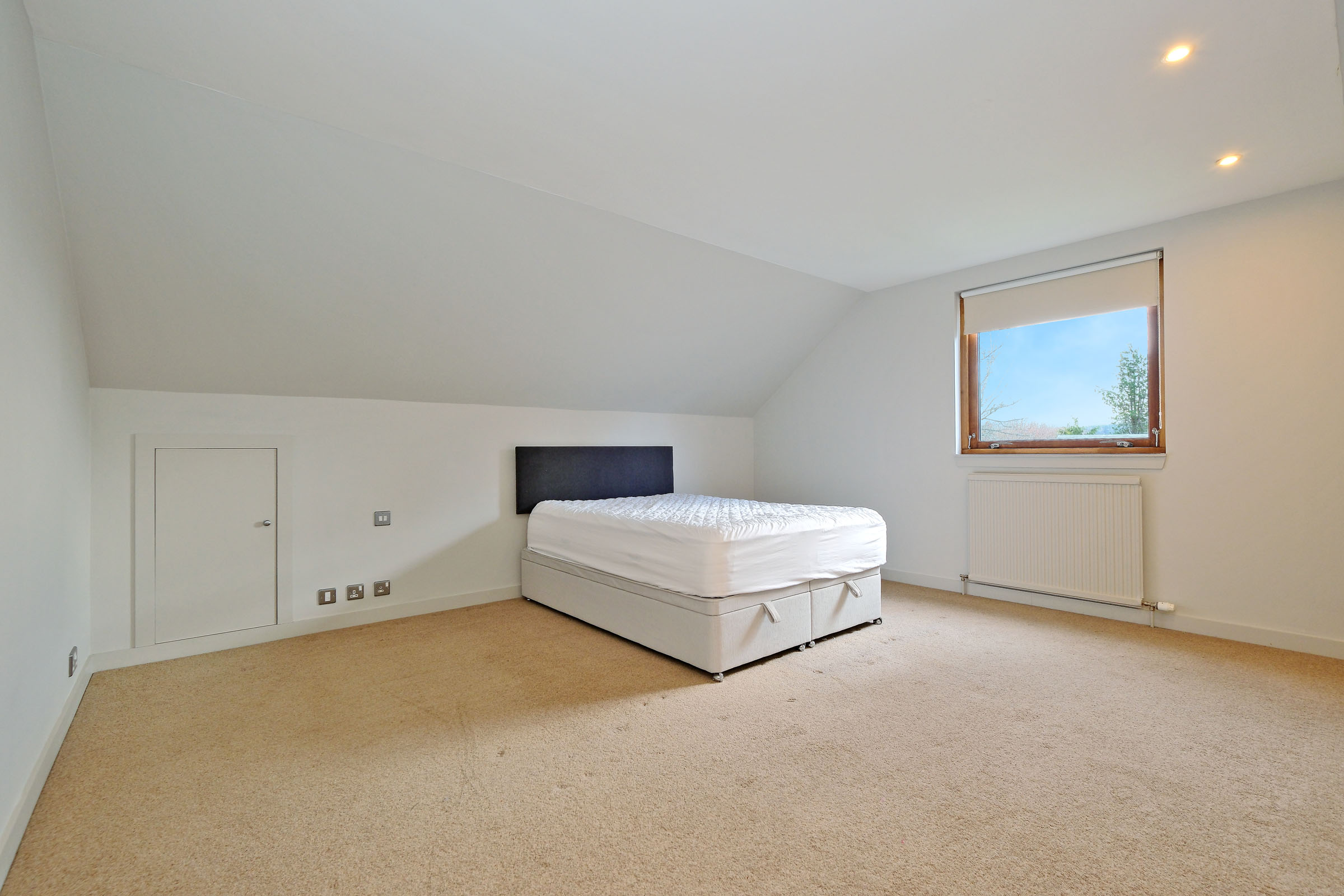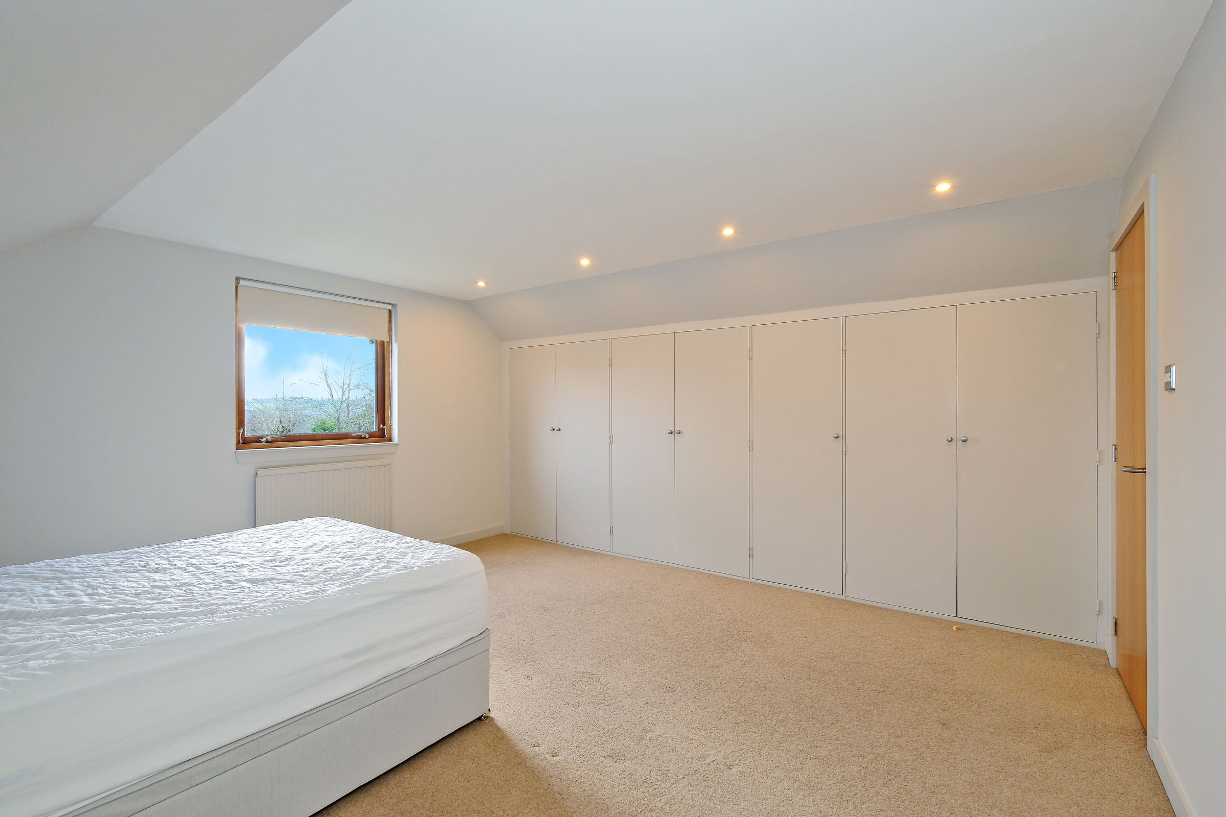 The generously proportioned principal bedroom is fully carpeted and lit by spotlights. A large window provides views of the front garden and across the neighbouring rooftops to the hillside beyond. The principal bedroom also boasts a wealth of storage, in the form of wall to wall deep built in wardrobes with an abundance of shelf and hanging space.