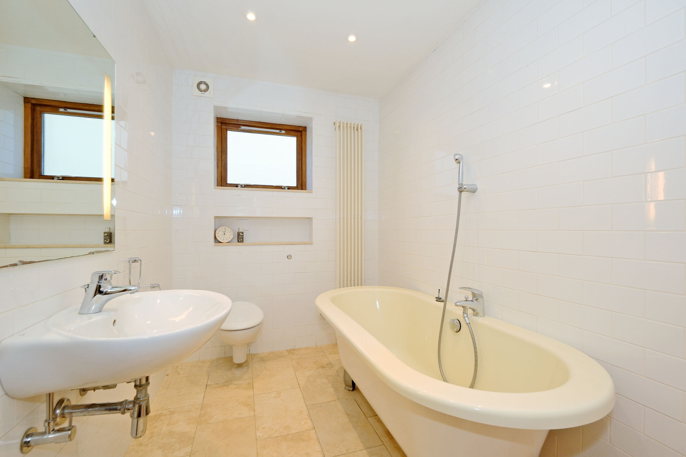 Returning to the reception hall, double bedroom three is a spacious, bright room with two windows overlooking the rear garden. Of neutral décor and fitted with oak flooring, the bedroom lies in close proximity to the attractive family bathroom. Fully tiled in white with travertine marble floor tiling, the bathroom is fitted with a three piece suite, consisting of a wash hand basin, WC and freestanding bath with shower attachment.