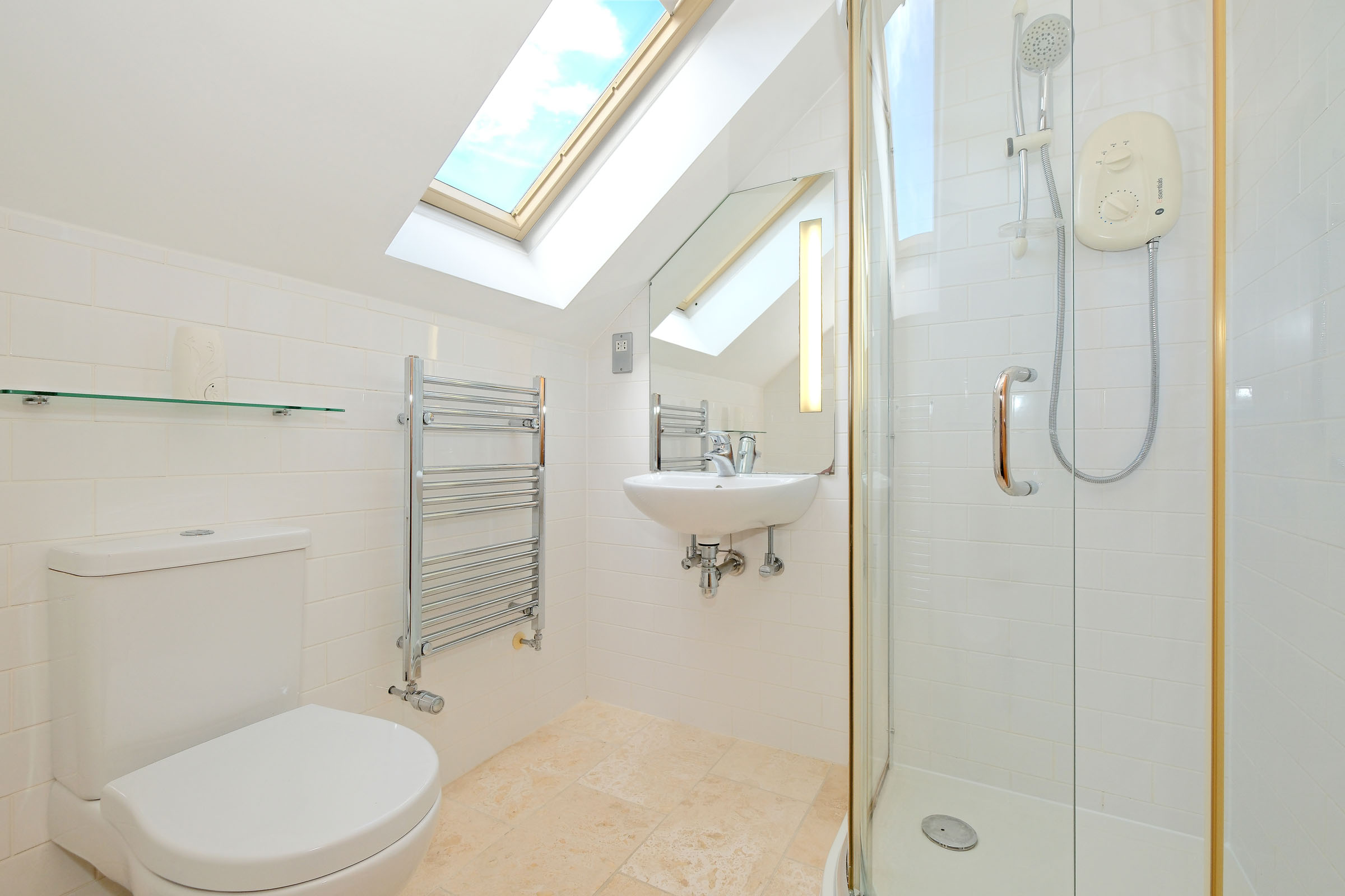 Completing the accommodation is the well appointed shower room. Fully tiled in white with travertine marble flooring, the shower room is fitted with a Velux window, a white two piece suite and a curved shower enclosure with sliding door panel, housing an electric shower appliance.