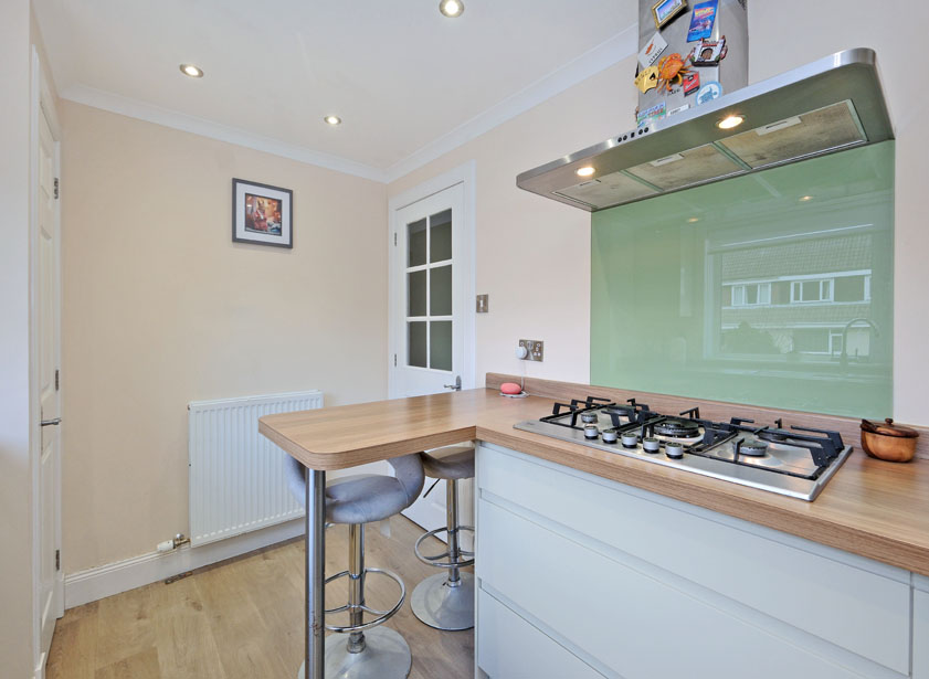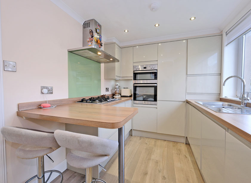 A well- maintained communal entrance / stairwell leads to the property entrance. The flat is entered via the generous and welcoming hallway which benefits from a deep, which in turn leads on to all accommodation. A deep walk-in store provides excellent storage facilities. The exceptionally light and airy lounge with large picture window floods the room with natural light and overlooks the communal grounds to the rear. A bright modern kitchen which is fitted with a range of wall and base units in a contemporary gloss finish with ample work surface incorporating breakfast bar seating and matching upstands. 5 ring integrated gas hob with extractor canopy and glass splash back will remain along with the integrated fridge, freezer, washing machine and dishwasher. Fitted cupboard houses the central heating boiler and additional storage space. Window overlooks the front of the property.