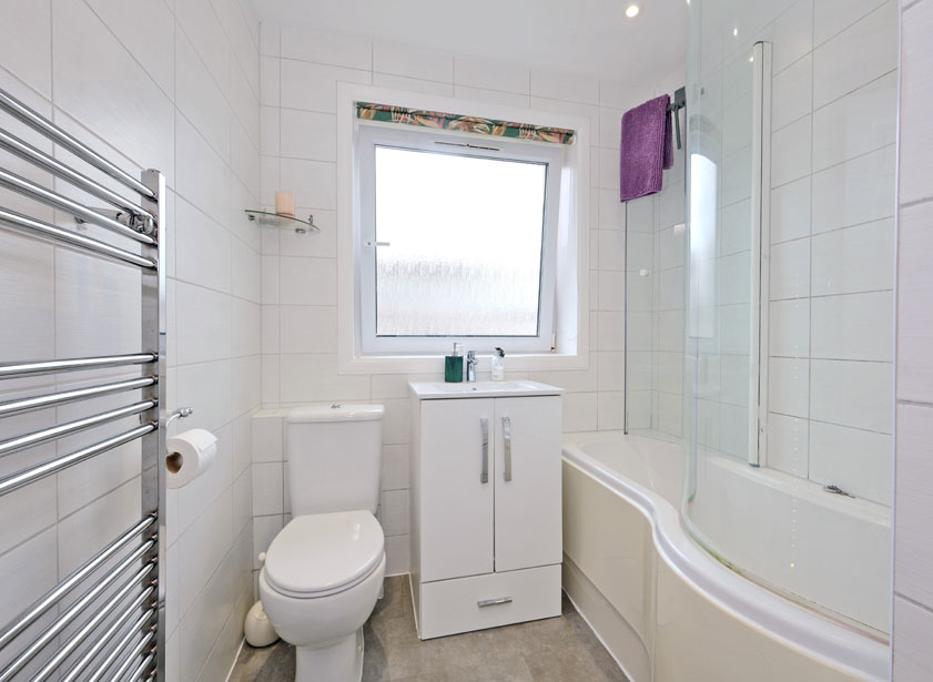 The bright bathroom is fitted with a white three piece suite with MIRA shower over the bath and glazed screen alongside. Fully tiled throughout, heated towel rail, Opaque window.