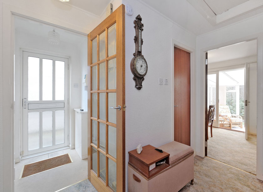 A glazed exterior door leads to a bright vestibule with fitted cupboard housing the electricity fuse box and meter. Wall mounted alarm panel. Glazed internal door to reception hall.