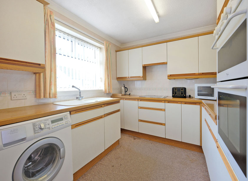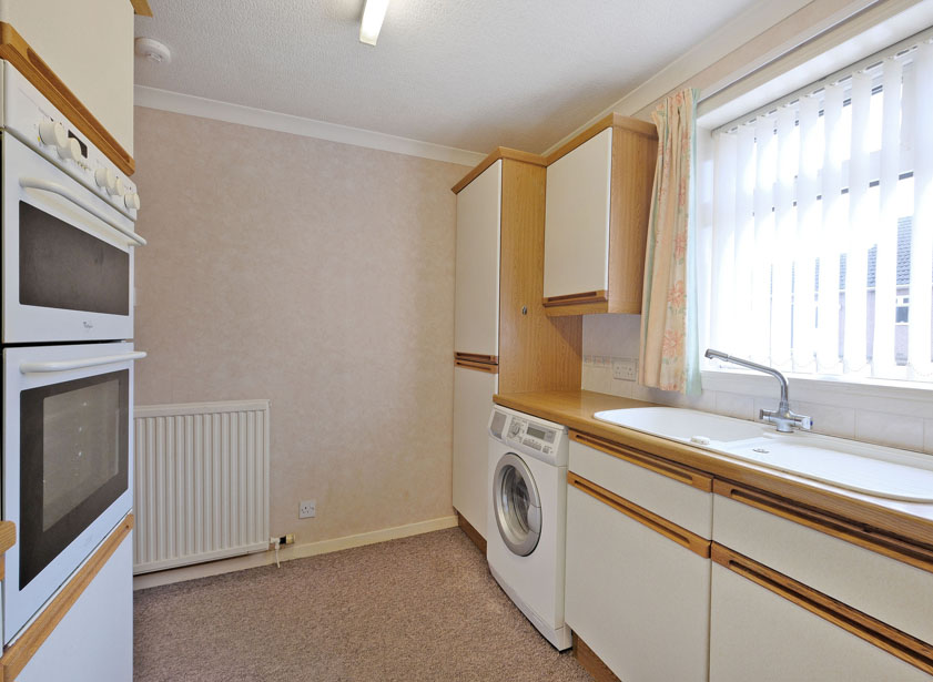 A well-appointed kitchen is fitted with a wide range of wall and base units with ample work surface and extensive splash back tiling. Asterite sink with mixer tap and drainer. Integrated hob, double oven/grill and fridge/ freezer to remain along with the free standing washing machine. Window overlooks the front of the property.