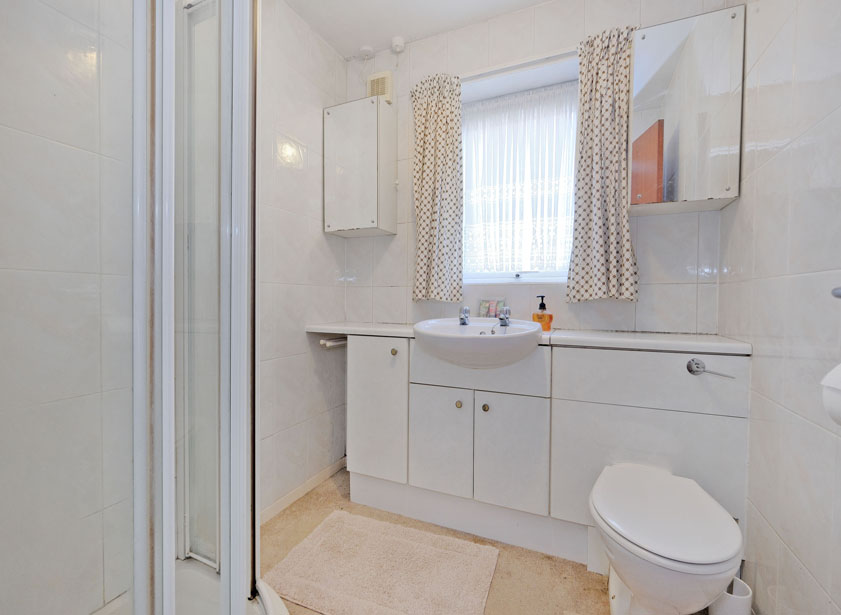 A bright shower room is fitted with a white suite incorporating a vanity unit housing wash hand basin and w/c. Fully tiled shower enclosure housing a MIRA shower. Opaque window to the side.