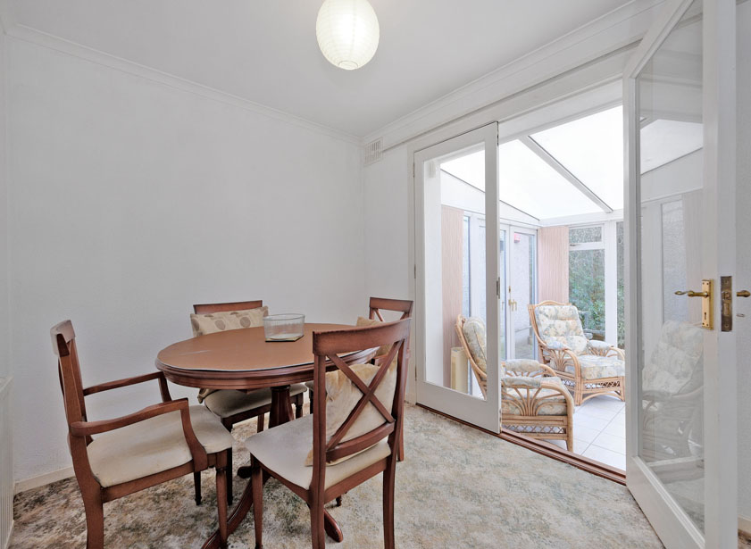 A further double bedroom is currently used as a formal dining room with ample space for a range of furnishings. Extensive fitted wardrobes with sliding mirrored doors offer ample storage space. Double French doors lead to the conservatory.