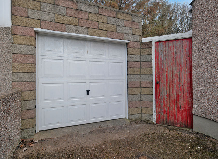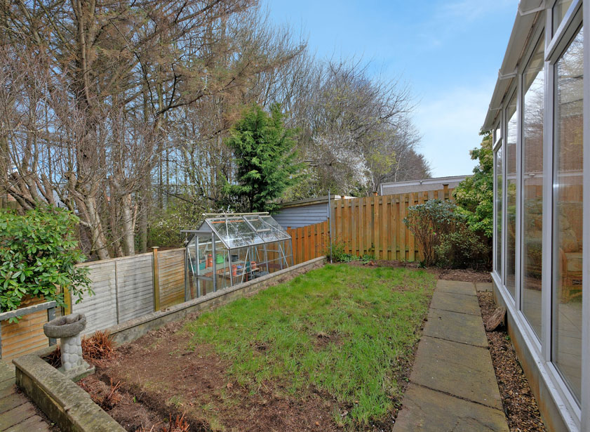 The front garden is enclosed by a low level stone wall, fully laid to paving for easy maintenance and additional parking. Tarred driveway to the side offers off road parking and leads to the good sized single garage with electric up and over door, equipped with power and light and featuring an inspection pit. A high level timber gate gives access to the fully enclosed rear garden. Paved path leads to an area of lawn with steps down to a further area of lawn, mature woodland back drop. Green house to remain.