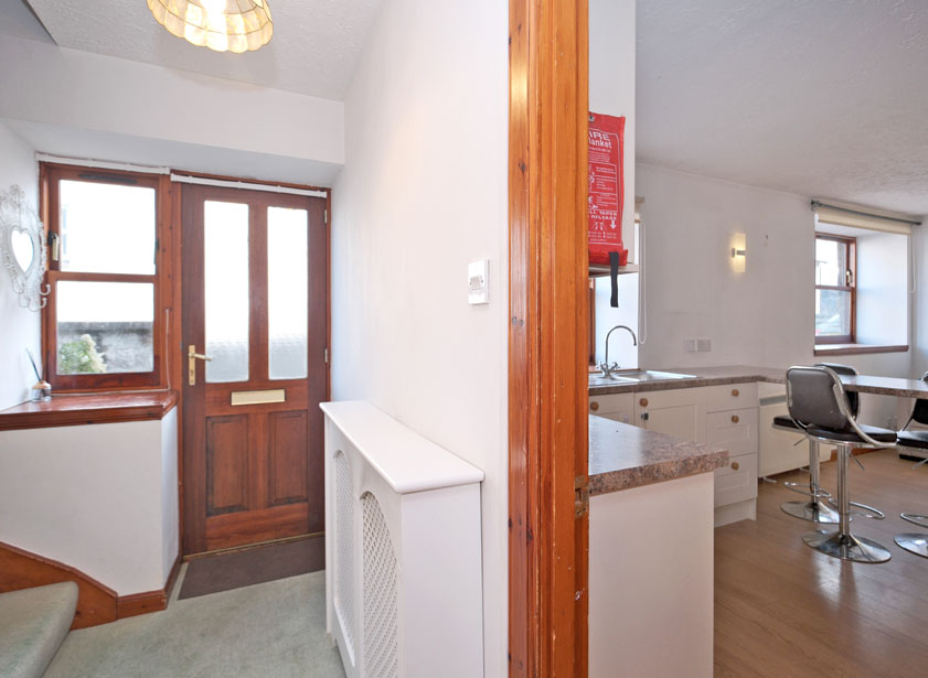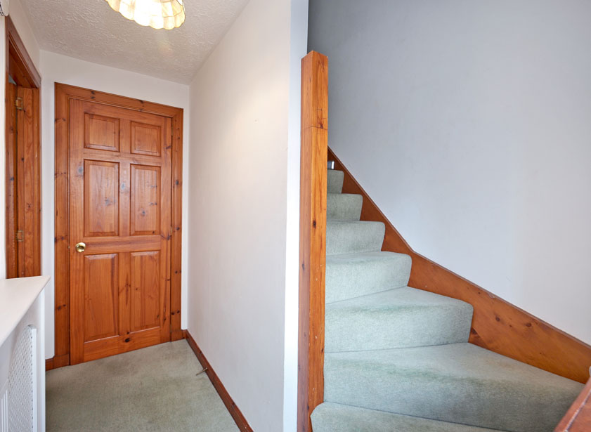 Returning to the main hallway, a carpeted staircase ascends to a small landing where a door gives access to a generous, bright and inviting living space.