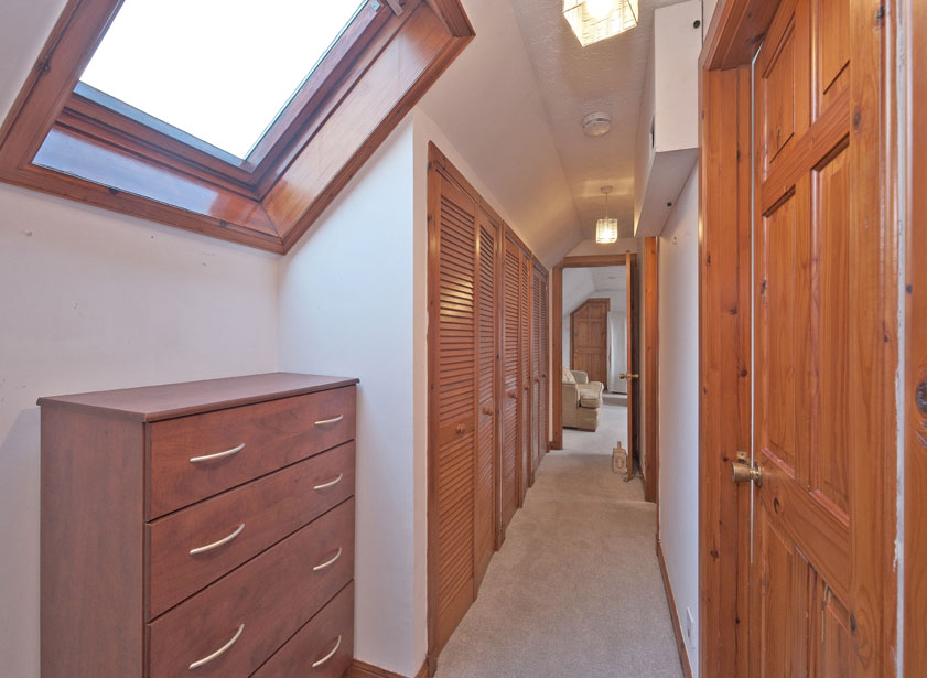 Beyond the upper floor living space, a hallway gives access to three bedrooms and the family bathroom. The upper hallway is notably bright; it provides extensive fitted storage and space for a desk.