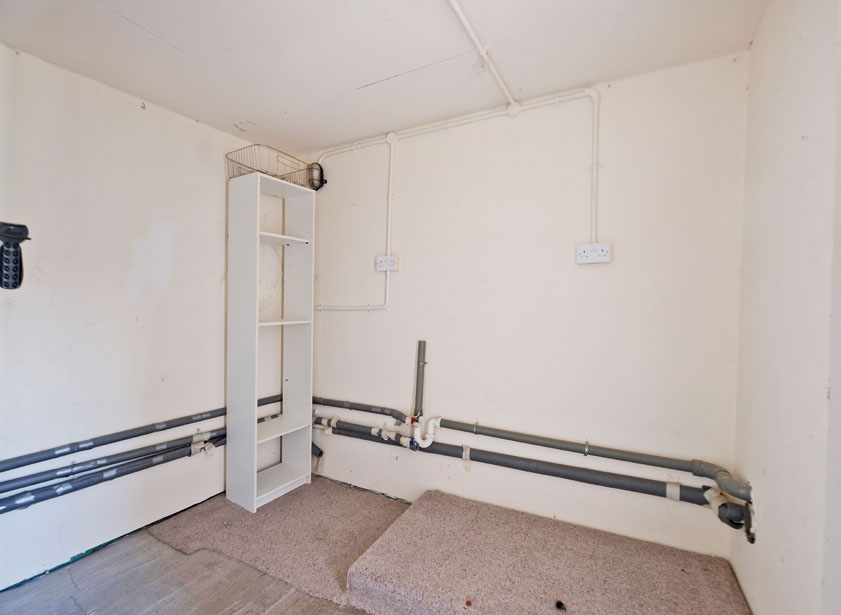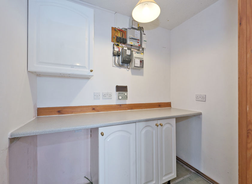 The utility room is fitted with base and wall storage units, it has plumbing for a washing machine and houses the water tank.
