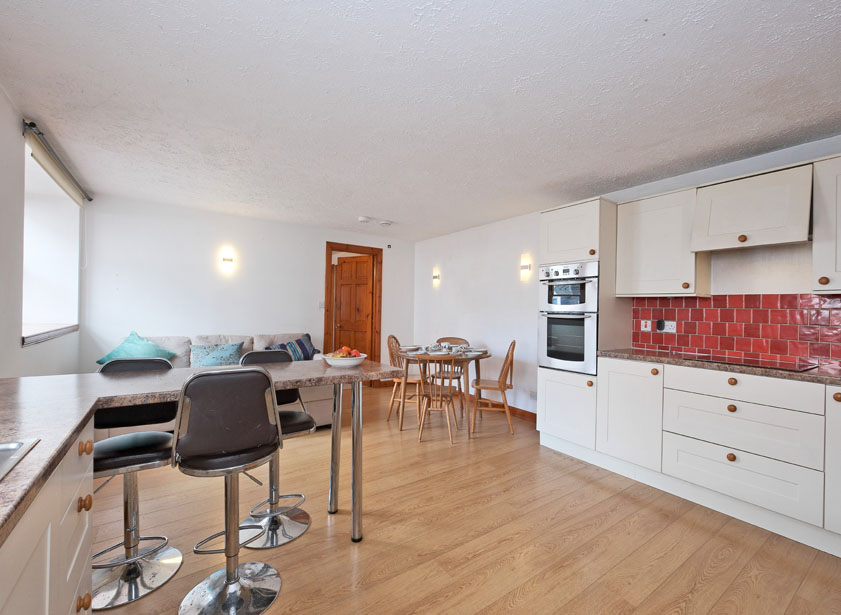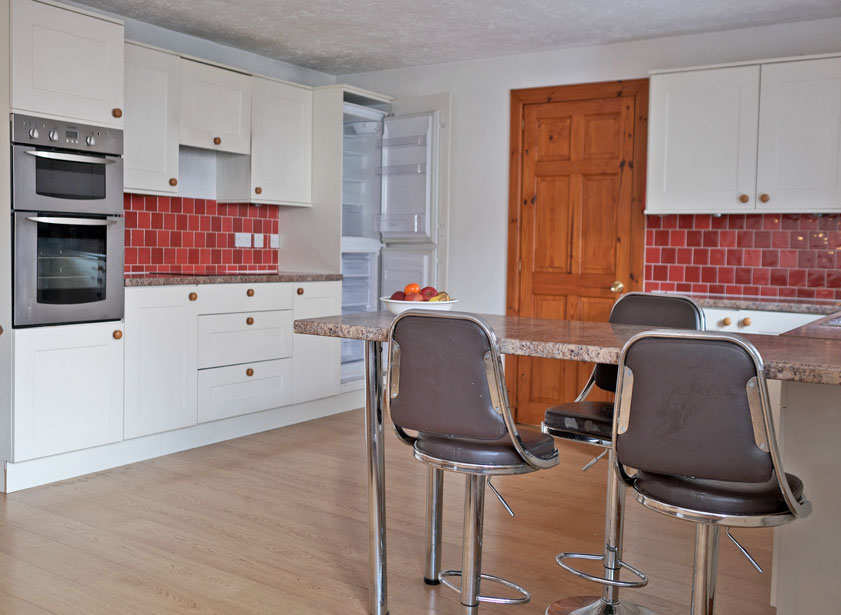 The dining kitchen is fitted with a range of cream matte base and wall units with complementing granite effect work tops and tiled splashbacks. The fitted kitchen incorporates a breakfast bar for informal dining, double oven, induction hob with extractor fan above, a dishwasher and a fridge freezer. The room is sufficiently proportioned for the placement of a large table and lounge furniture.