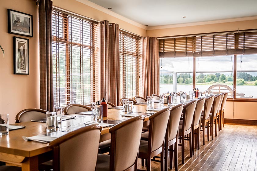 Enter the Lodge On The Loch via the main entrance into a reception/entrance foyer which branches off to the open plan restaurant/dining area and bar. Doors on two sides of the dining room/bar provide access to the deck which wraps around the property’s frontage. The deck has been thoughtfully zoned to provide a flow with privacy. A well-appointed, fully fitted commercial kitchen is accessible from the dining room and bar area. A door leads directly outside from the kitchen.