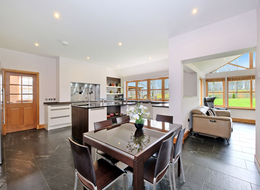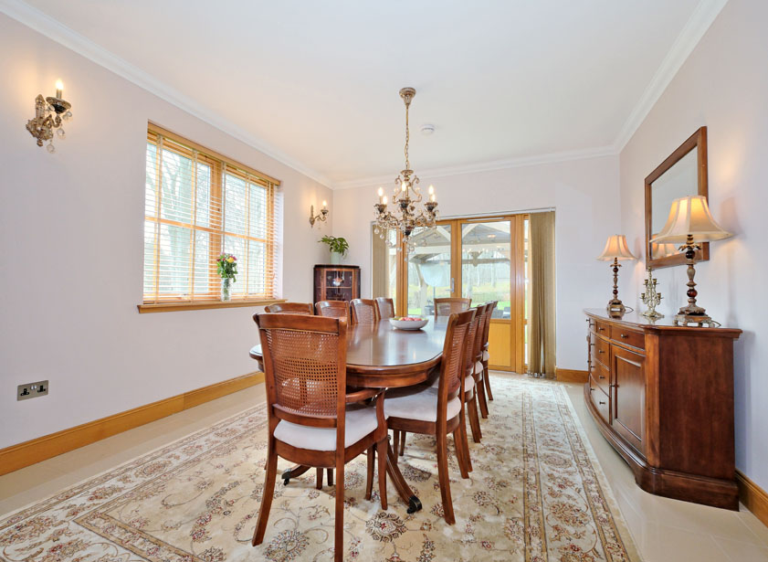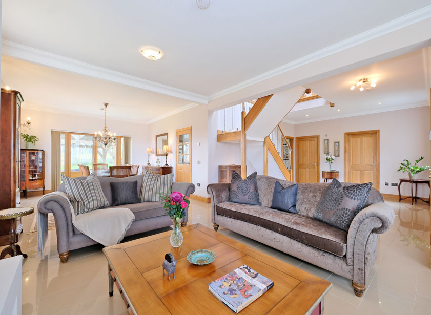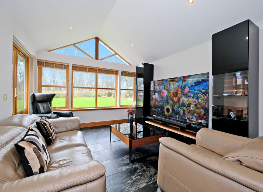 On open plan with the dining kitchen, a spacious sun lounge with vaulted ceiling and glazed apex window and further picture window overlooking the rear garden and mature woodland beyond. Double French doors to the rear terrace. Sherpa stone floor with under floor heating.