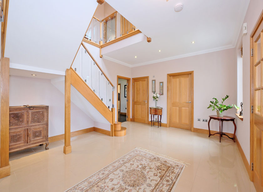 Entered via double composite exterior doors with decorative glazed sections, this bright vestibule benefits from a double fitted cloaks cupboard providing shelf and hanging facilities. Italian porcelain tiled floor with under floor heating. Double doors with glazed panels to reception hall.
