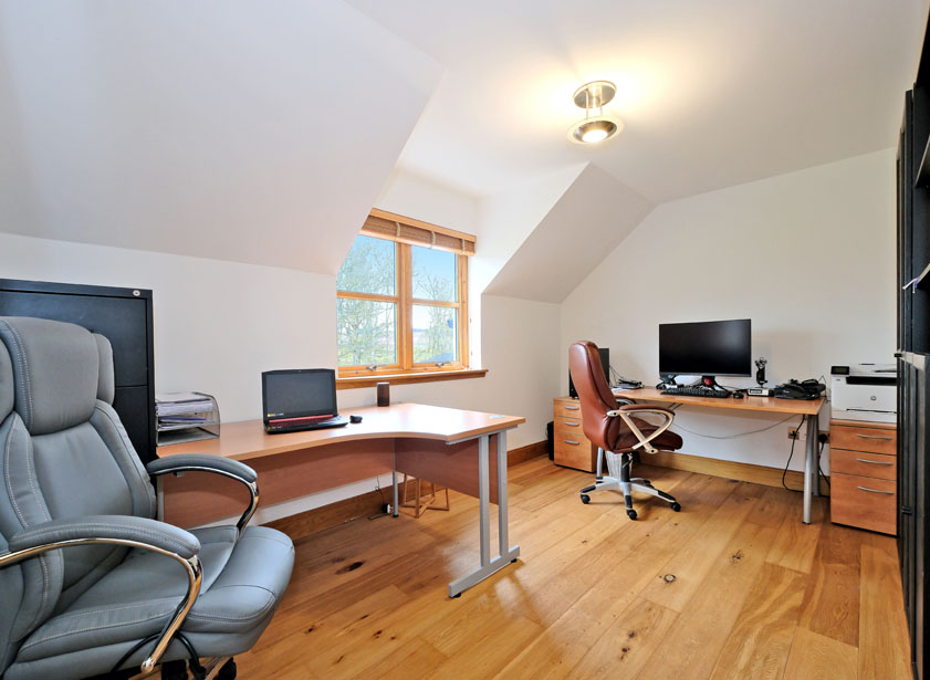 The additional double bedroom located on the upper floor is currently used as a home office which overlooks the rear with ample space for a range of furnishings. A double fitted wardrobe offers shelf and hanging space. Engineered oak flooring.